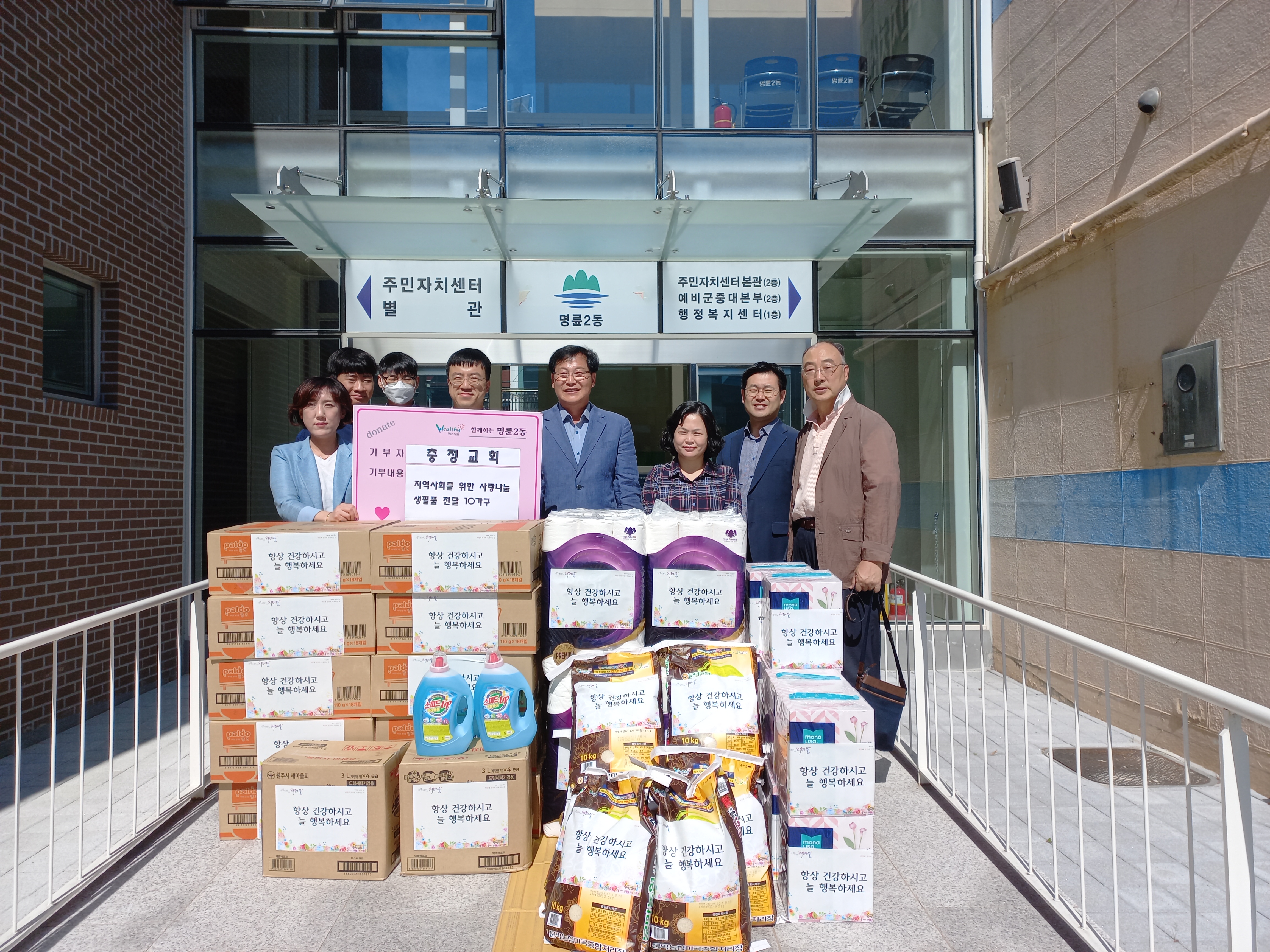 [강원사회복지신문 김도연 기자]=따뜻한 나눔문화 확산, 저소득 10가구 후원품 전달 원주충정교회(담임목사 최규명)는 명륜2동 저소득 어르신 등 10명에게 쌀, 휴지, 세제, 라면 등 후원물품을 전달하며 어려운 이웃을 향한 따뜻한 마음을 전달했다.