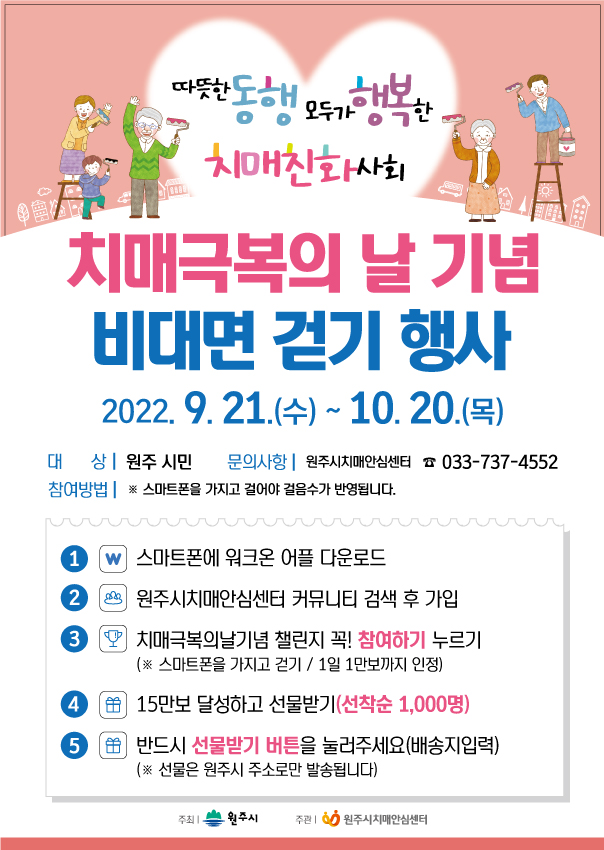 [강원사회복지신문 김도연 기자]=원주시치매안심센터(센터장 김진희)는 제15회 치매 극복의 날을 기념해 9월 21일부터 10월 20일까지 '따뜻한 동행, 모두가 행복한 치매 친화 사회'라는 슬로건으로 비대면 15만 보 걷기 행사를 개최한다. 이번 행사는 감염병 예방을 위해 기념식 대신 모바일 걷기 플랫폼 워크온(Walkon) 앱을...