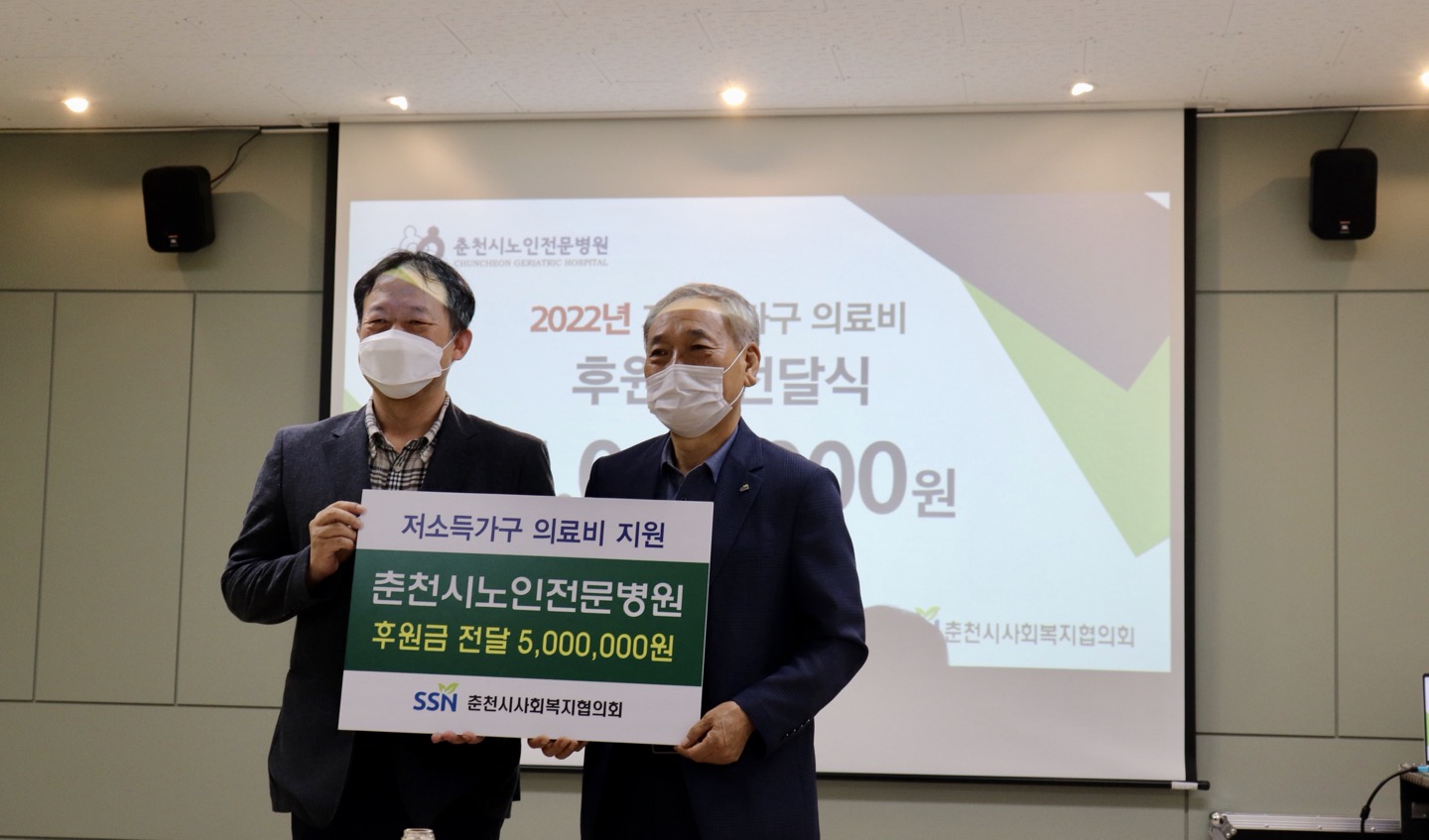 [강원사회복지신문 서은진 기자]=춘천시사회복지협의회(회장 신두진)는 지난 8월 8일(월) 춘천시노인전문병원(병원장 이승환)으로부터 지정후원금 오백만원을 전달 받고, '2022년 저소득 의료비 지원사업' 후원금 전달식을 가졌다. 전달식에는 신두진 춘천시사회복지협의회장, 이승환 춘천시노인전문병원장, 천선범 부장이 참...