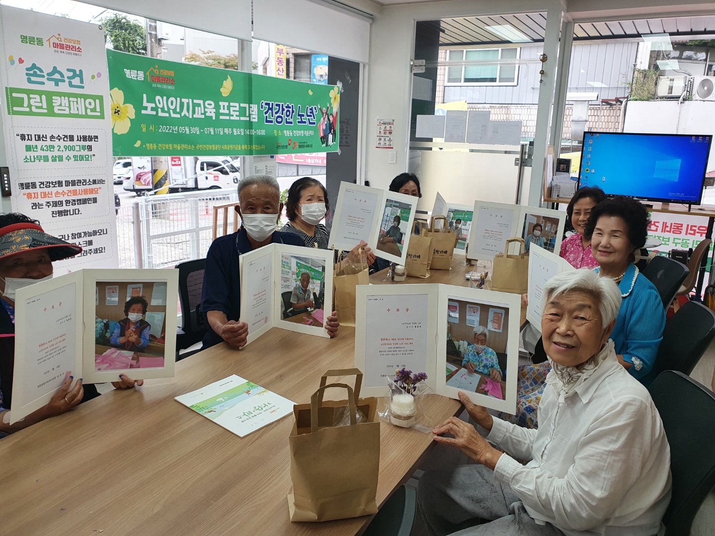 [강원사회복지신문 이정환 기자]=원주 명륜종합사회복지관(관장 박현숙)에서 운영하고 있는 명륜동 건강보험 마을관리소에서 6월부터 7월까지 진행한 노인인지교육 프로그램 수료식을 진행하였다. 이번 노인인지교육 프로그램에서는 건강 체조, 치매예방회상 미술원예 활동을 진행하였고, 수료식에서는 그동안 프로그램에 참...