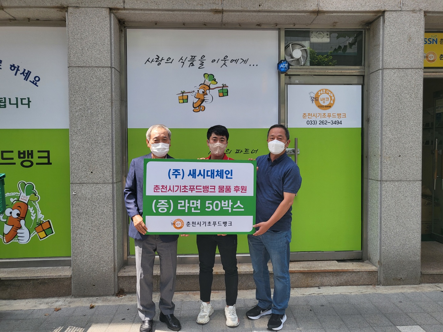 [강원사회복지신문 홍기한 기자]=(주)새시대체인(대표 엄태성, 엄석조)은 지난 7월 19일(화) 춘천시 지역 내 취약계층 및 저소득층을 위해 춘천시기초푸드뱅크(뱅크장 신두진)에 라면(50박스)를 후원하여 전달식을 가졌다. 이날 (주)새시대체인에서 후원한 라면은 푸드뱅크를 이용하고 있는 저소득 소외계층 300명에게 전달될...