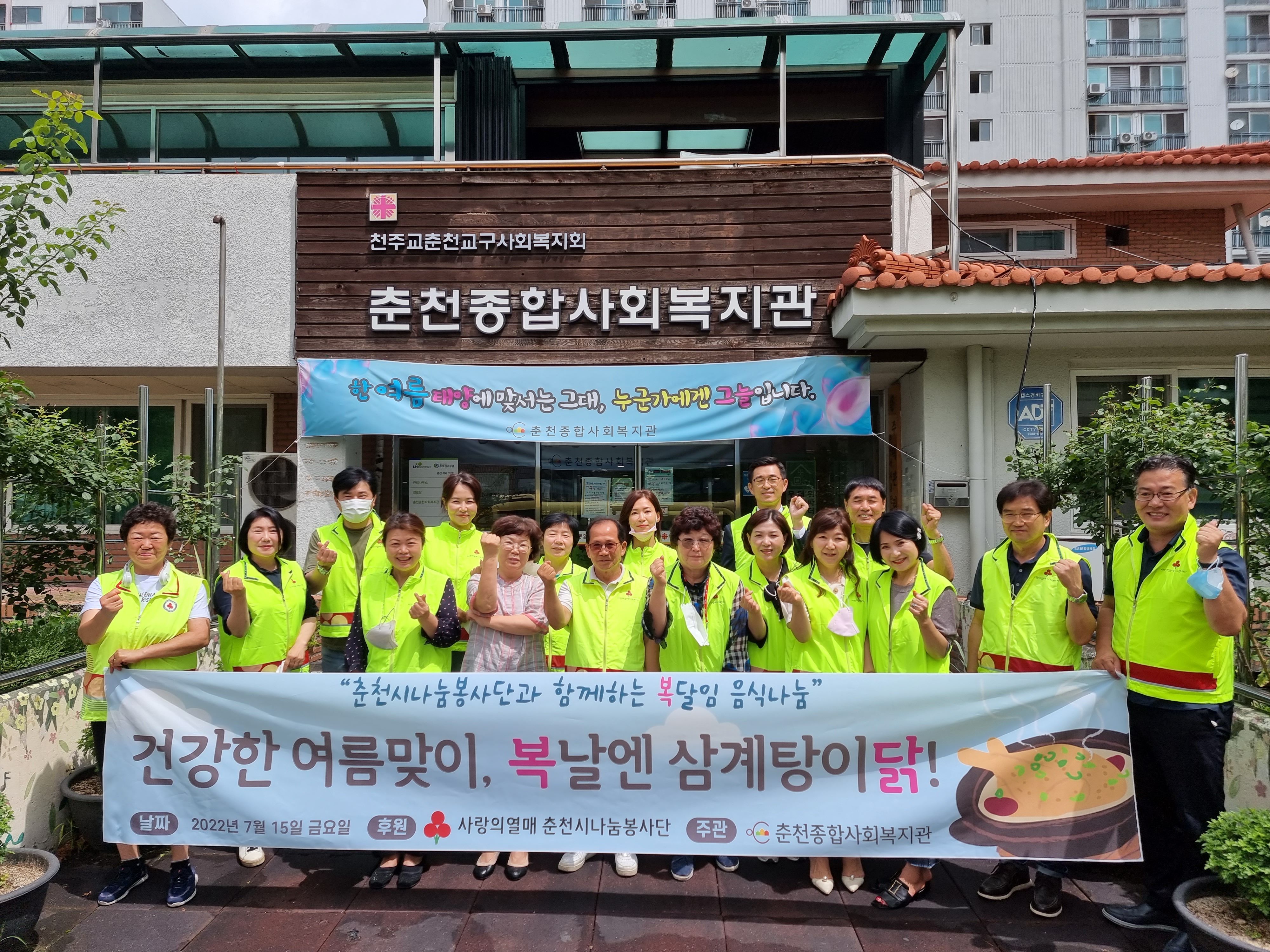 [강원사회복지신문 홍기한 기자]=춘천종합사회복지관(관장 오미경)은 사랑의열매춘천시나눔봉사단(단장 한금동)과 지난 7월 16일 초복을 맞이하여 어르신들을 위한 여름철 보양음식을 준비했다. '복달임 음식나눔'은 건강한 여름을 보낸다는 뜻을 가지고 있으며, 코로나로 인해 많이 지치신 어르신들이 보양음식인 삼계탕과 ...