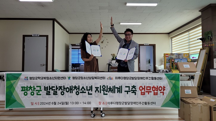 평창군학교밖청소년지원센터·평창군청소년상담복지센터(센터장 박금성, 이하 ‘청소년지원센터’)와 이루다평창군발달장애인주간활동센터(센터장 김미숙, 이하 ‘이루다센터’)는 지난 6월 24일 관내 ‘발달장애청소년들의 안전하고 건강한 사회구성원으로의 성장을 지원하고, 필요 서비스의 효율적 제공을 위한 지원체계 구...