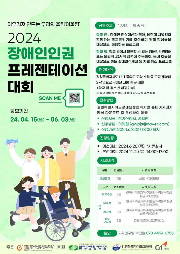 강원특별자치도장애인종합복지관(관장 : 엄정호)에서는 지역주민의 장애인인권에 대한 관심을 확대하고, 청소년들이 가진 장애인 권익옹호 역량을 향상시키기 위해강원특별자치도장애인종합복지관 주최, 한국수력원자력(주) 한강수력본부, 강원특별자치도교육청, G1방송 후원으로 ‘2024 장애인인권 프레젠테이션 대회’를 개...