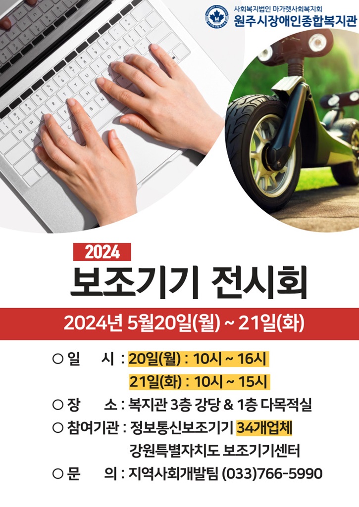 원주시장애인종합복지관(관장 정진애)에서는 2024년 5월 20일(월)부터 21일(화), 이틀에 동안 “2024년 정보통신보조기기 박람회 및 보조기기 전시회”를 진행한다. 이번 전시회에서는 한국지능정보사회진흥원과 강원특별자치도 보조기기센터와 함께하며 34개 보조기기업체가 참여하여 장애인을 위한 정보통신보조기기와 스마...
