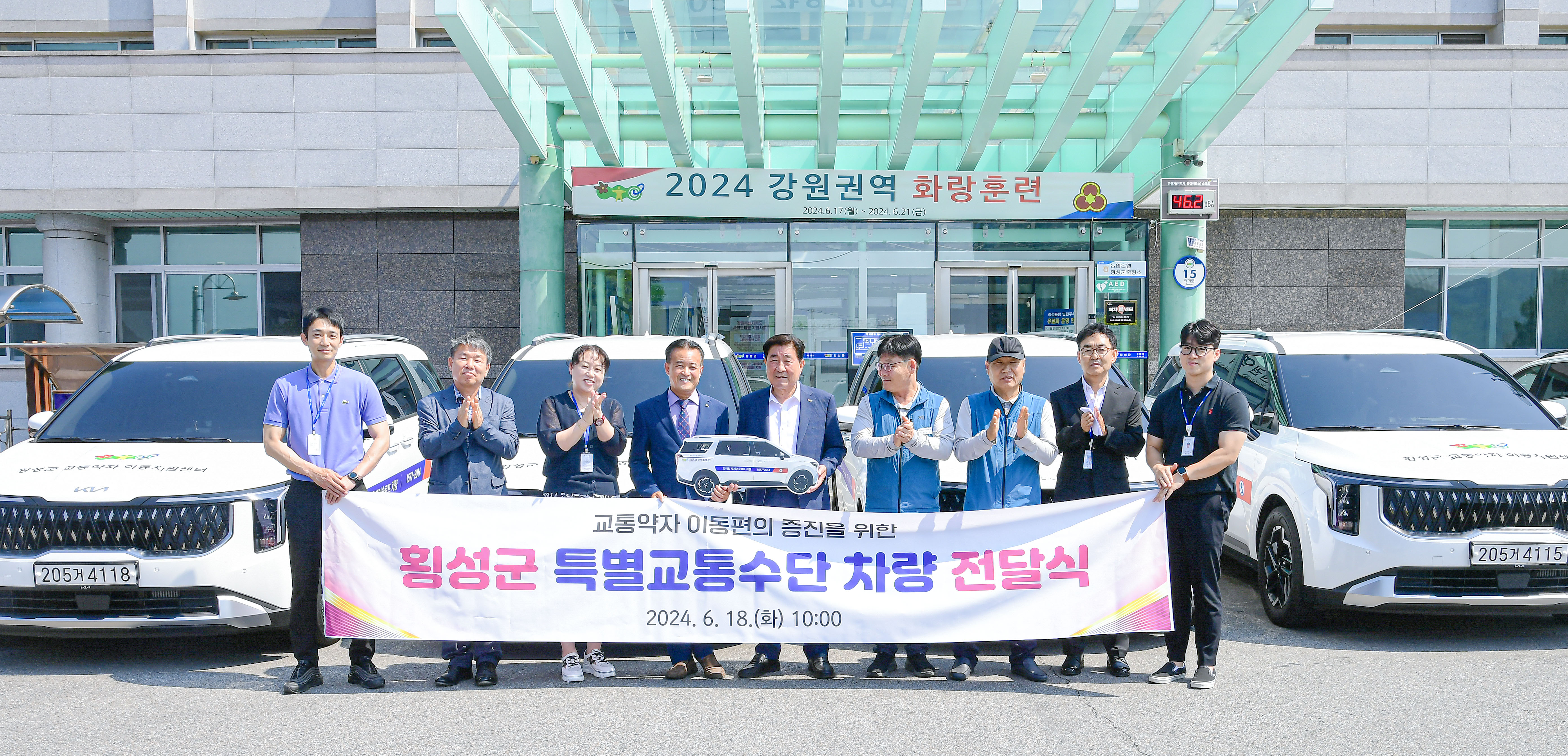 횡성군(군수 김명기)은 구매한 특별교통수단 차량 4대를 지체장애인협회 횡성군지회(회장 이명수)에 전달하기 위해 지난 6월 18일 횡성군청에서 특별교통수단 차량 전달식을 개최했다. 전달식에는 김명기 군수와 이명수 지체장애인협회 횡성군지회장, 김태영 지체장애인협회 사무국장을 비롯한 관계자 10여 명이 참석했다. 횡...