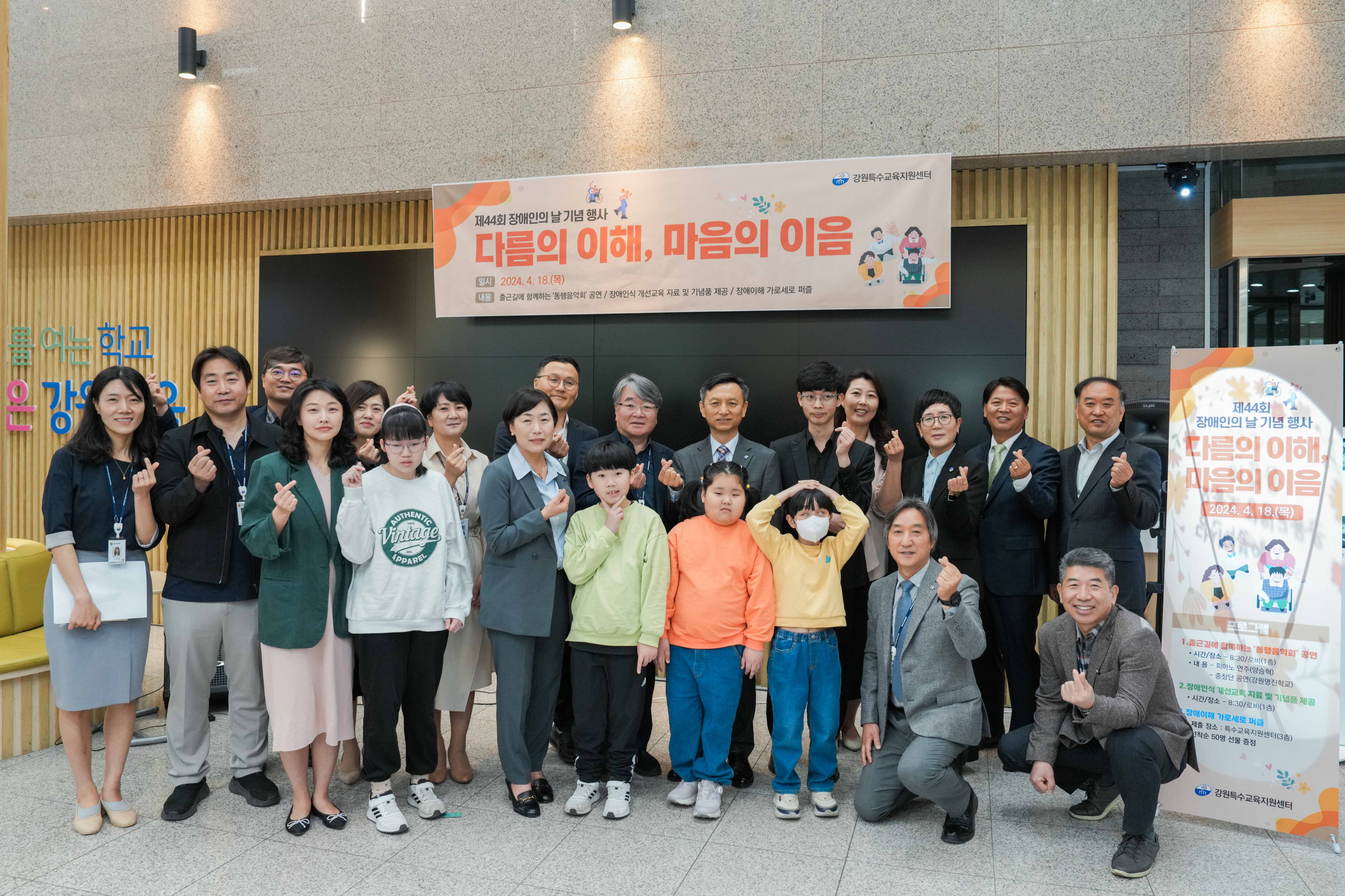 “장애인에 대한 이해 및 인식 개선, 장애공감문화 확산” 강원특별자치도교육청(교육감 신경호)은 4월 18일(목) 도교육청 1층 로비에서 ‘다름의 이해, 마음의 이음’이라는 표어로 제44회 장애인의 날 기념행사를 개최했다. 기념행사는 △출근길에 함께하는 ‘동행 음악회’ △장애인식개선교육 자료 배부 △장애이해 가로...