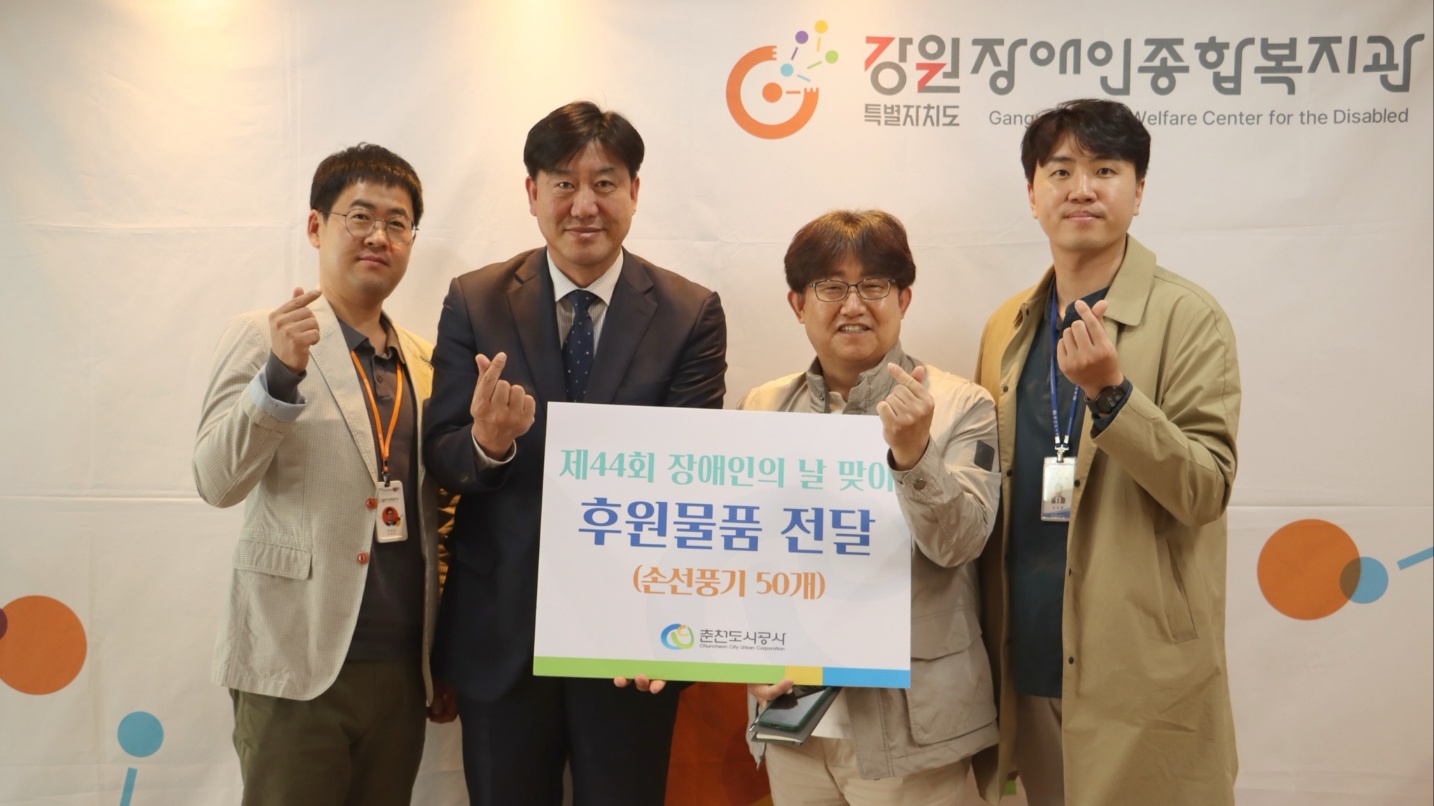 춘천도시공사(사장 홍영)는 지난 4월 19일 제44회 장애인의 날을 맞이하여 관내 저소득층 장애인을 위한 후원 나눔 사회공헌활동을 실시했다고 밝혔다. 춘천도시공사 직원들의 모금을 통해 강원특별자치도장애인종합복지관 50가정에 손선풍기를 전달하였다.