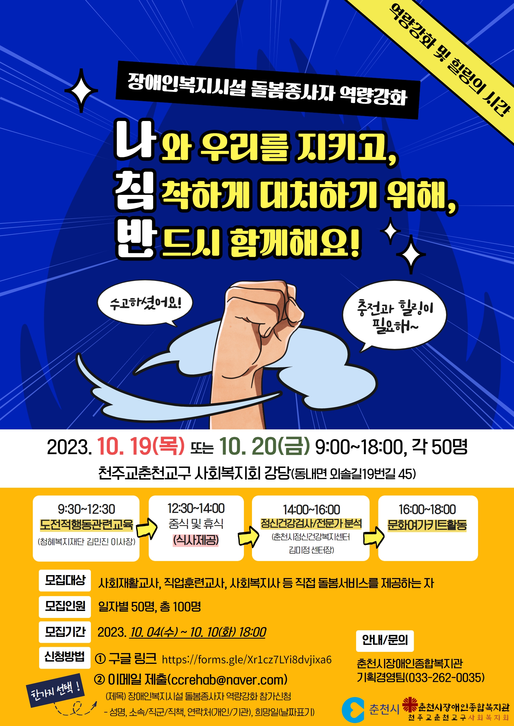 [강원사회복지신문 최재석 기자]=춘천시장애인종합복지관(관장:유미)은 오는 10월 19일(목)과 10월 20일(금) 2일 간 50명씩 총 100명의 장애인복지시설 돌봄종사자(사회재활교사, 직업훈련교사, 사회복지사 등)를 대상으로 역량강화사업을 진행한다. 춘천시의 지원을 받아, 천주교 춘천교구 사회복지회 강당(춘천시 동내면 외...