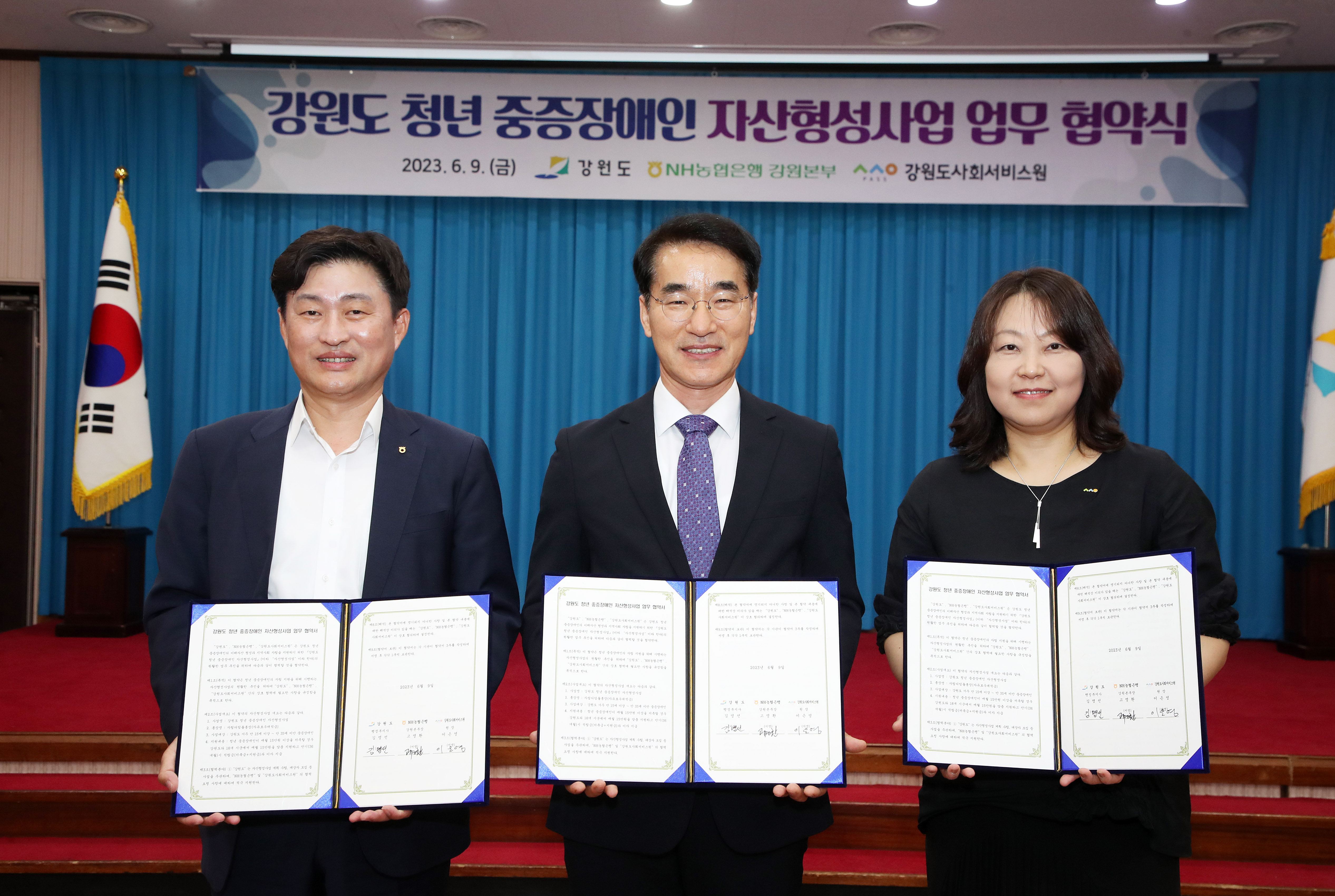 [강원사회복지신문 홍기한 기자]=강원도는 지난 6월 9일 도청 회의실에서 김명선 행정부지사, 고명환 NH농협은행 강원본부장, 이은영 강원도사회서비스원장 등 관계자들이 참석한 가운데 '강원도 청년 중증장애인 자산형성사업' 추진을 위한 업무 협약식을 개최했다. 이번 협약으로 강원도는 사업 계획 수립, 대상자 모집 등...