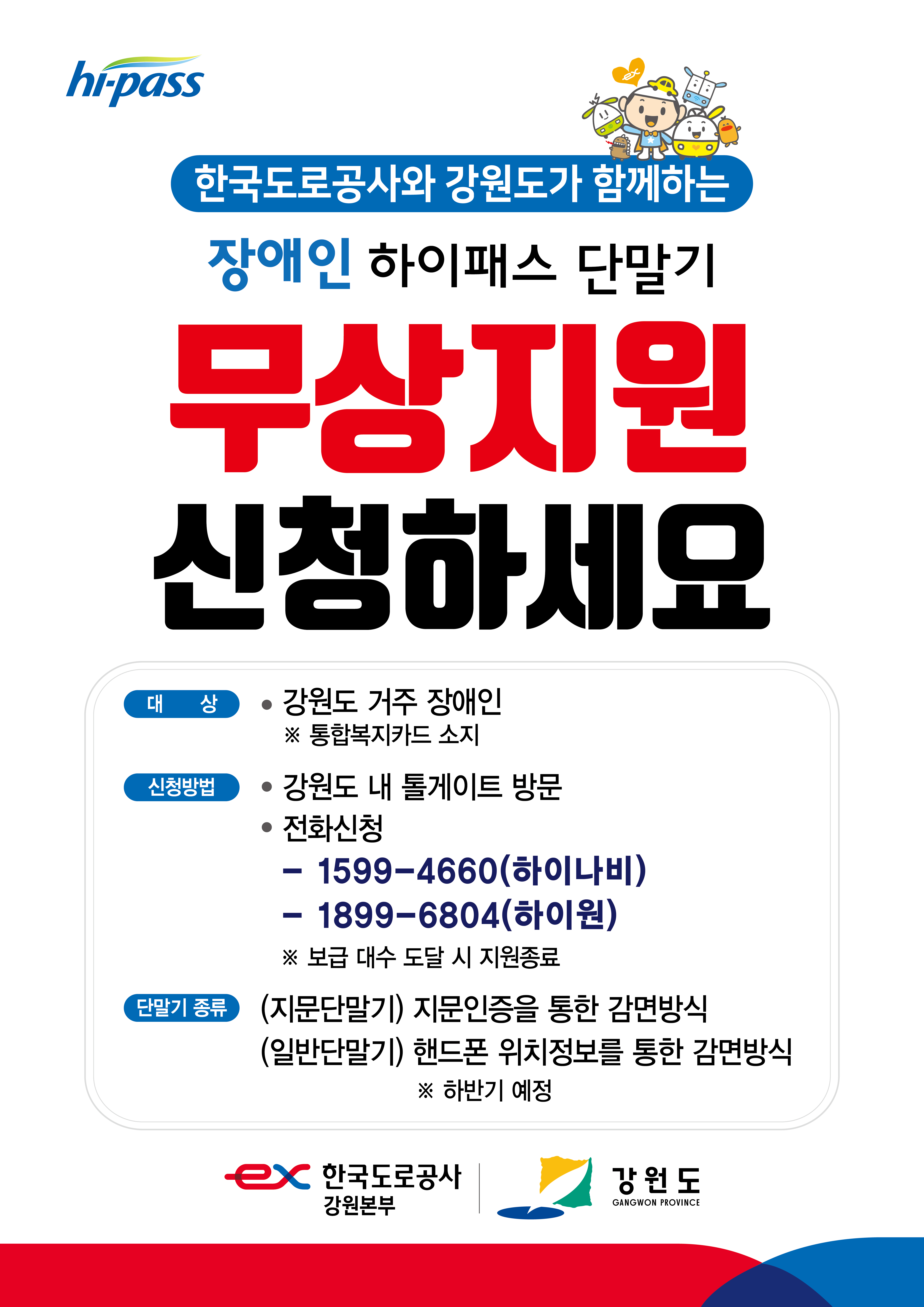 [강원사회복지신문 김도연 기자]=한국도로공사 강원본부 관할 영업소 방문 또는 전화로 신청 원주시는 한국도로공사 강원본부와 함께 장애인 차량 하이패스 단말기를 무상 지원한다. 지원 대상은 신청일 기준 5년 이내 단말기 무상 지원을 받지 않은 강원도 거주 장애인이다. 대상 차량은 본인 명의 소유 또는 동일한 세대별...