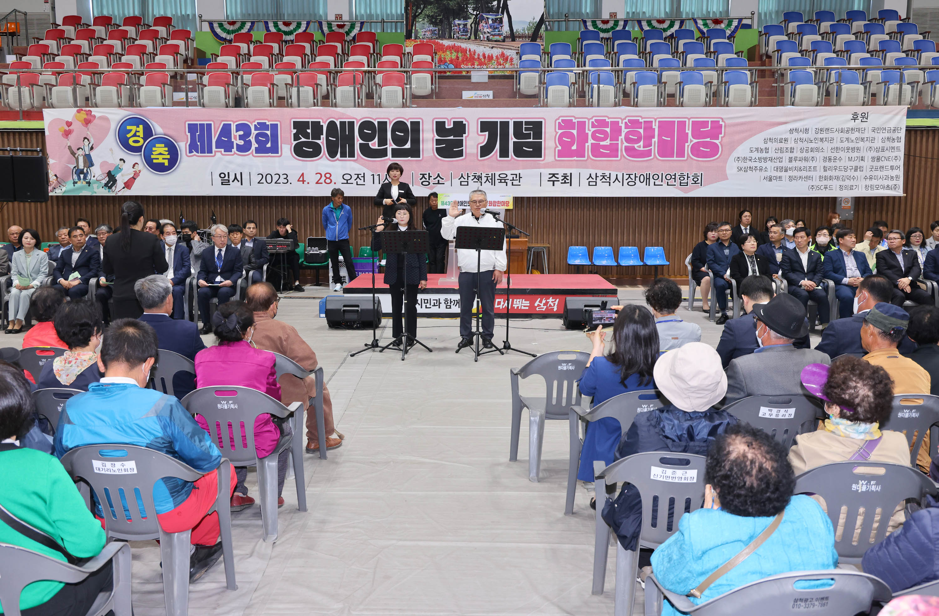 [강원사회복지신문 김종한 기자]=지난 4월 28일(금) 오전 11시 삼척체육관에서 제43회 장애인의 날 기념식 화합 한마당 행사가 열렸다. 이날 행사에는 관내 장애인들과 가족, 지역주민, 자원봉사자 등 1,500여 명이 참석했으며, 기념식은 장애인인권헌장 낭독, 장애인복지 증진 유공자 표창, 장기자랑, 초청가수 축하공연 등...