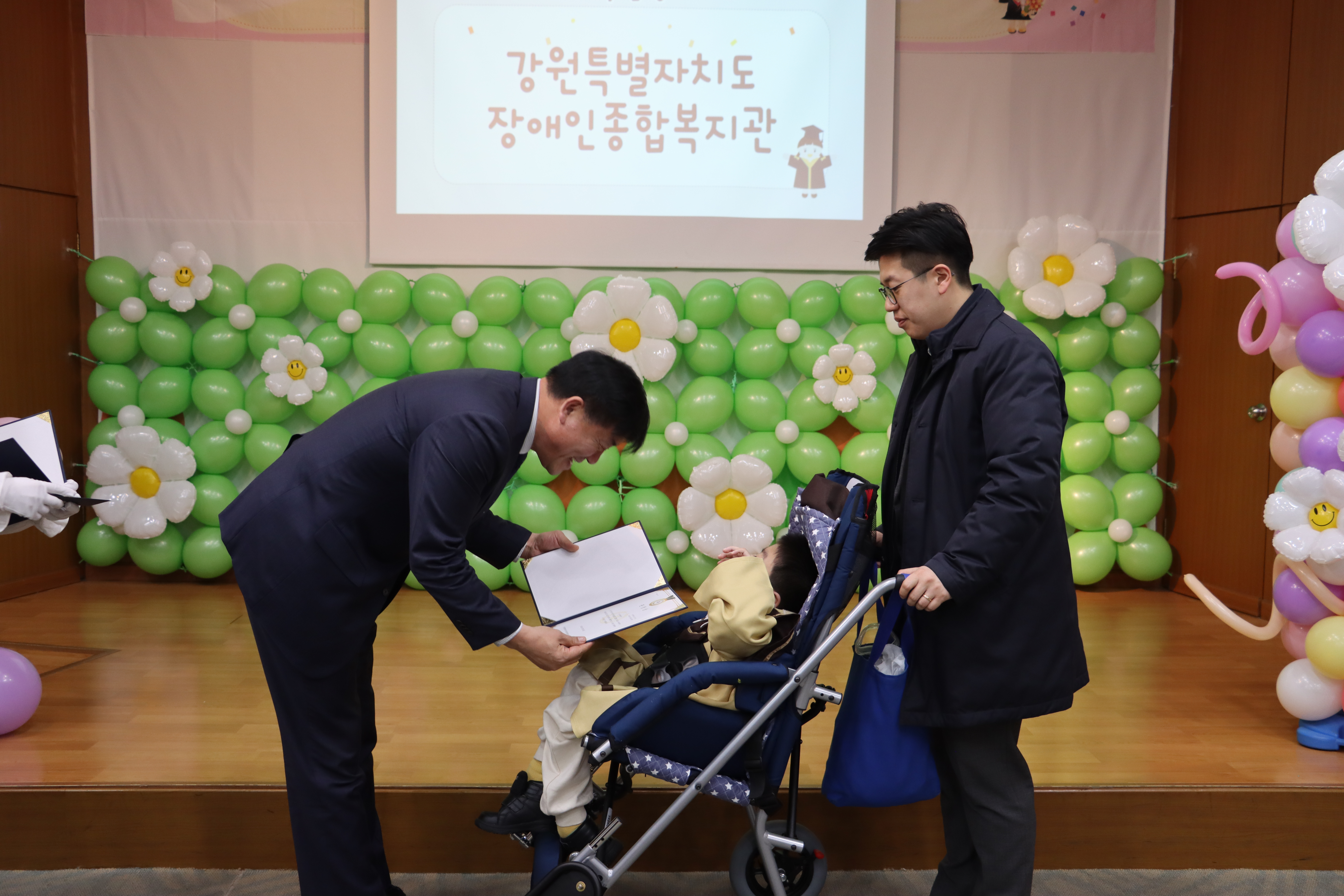 강원특별자치도장애인종합복지관(관장 : 엄정호) 부설 장애전담 어린이집 하나어린이집에서는 2월 26일(목)에 복지관 내 한울터에서 졸업생 4명과 수료생 27명을 대상으로 졸업 및 수료식을 진행하였다. 이날 행사에는 졸업/수료생과 가족들 뿐 아니라 다양한 유관기관 단체의 내빈(강원특별자치도장애인종합복지관장 엄정호...