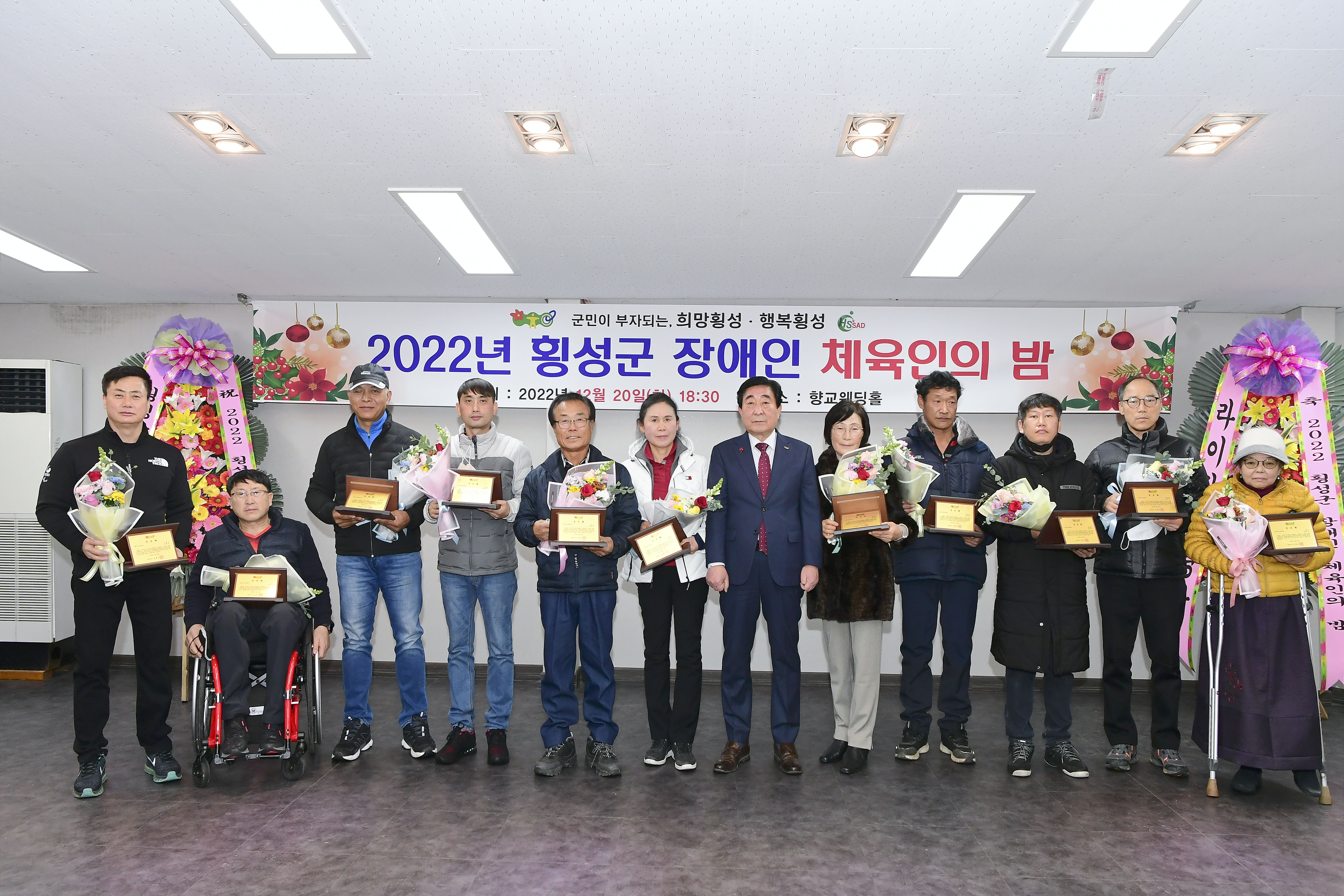 [강원사회복지신문 홍기한 기자]=횡성군장애인체육회는 지난 12월 20일 횡성 향교웨딩홀에서 2022년을 마감하는 '2022년 횡성군 장애인 체육인의 밤' 행사를 개최했다. 이날 행사는 김명기 횡성군수를 비롯해 장애인체육회 임원 및 관내 장애체육인 가족 100여 명이 참석한 가운데 강원도장애인생활체육대회 및 전국장애인체...