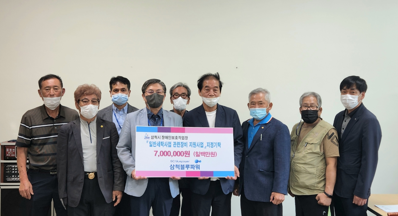 [강원사회복지신문 이정환 기자]=삼척시장애인보호작업장은 지난 7월 27일(수) 오전 11시 삼척시장애인종합복지센터 2층 회의실에서 삼척블루파워 옥인환 사장과 임직원들이 참석한 가운데 '일반세탁사업 관련장비 지원사업' 기증식 행사를 진행했다. 이번 기증식에서 삼척블루파워는 장애인고용창출의 일환인 일반세탁사업의...