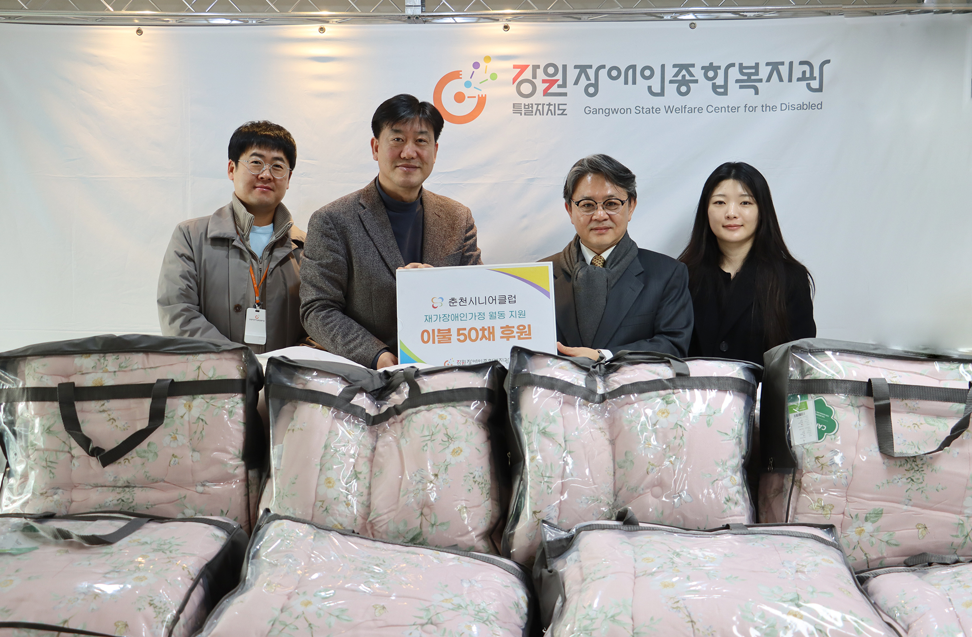 춘천시니어클럽(관장:이정훈)은 강원특별자치도장애인종합복지관(관장 엄정호)에 방문하여 춘천지역 내 재가장애인을 위한 이불 50채(500만원 상당)를 전달하였다. 춘천시니어클럽은 춘천시 내 어르신 일자리 창출과 사회활동을 지원하고 있으며, 어르신 복지 사업을 위해 힘쓰고 있다. 이번 후원물품은 새해를 맞이하여 춘천...