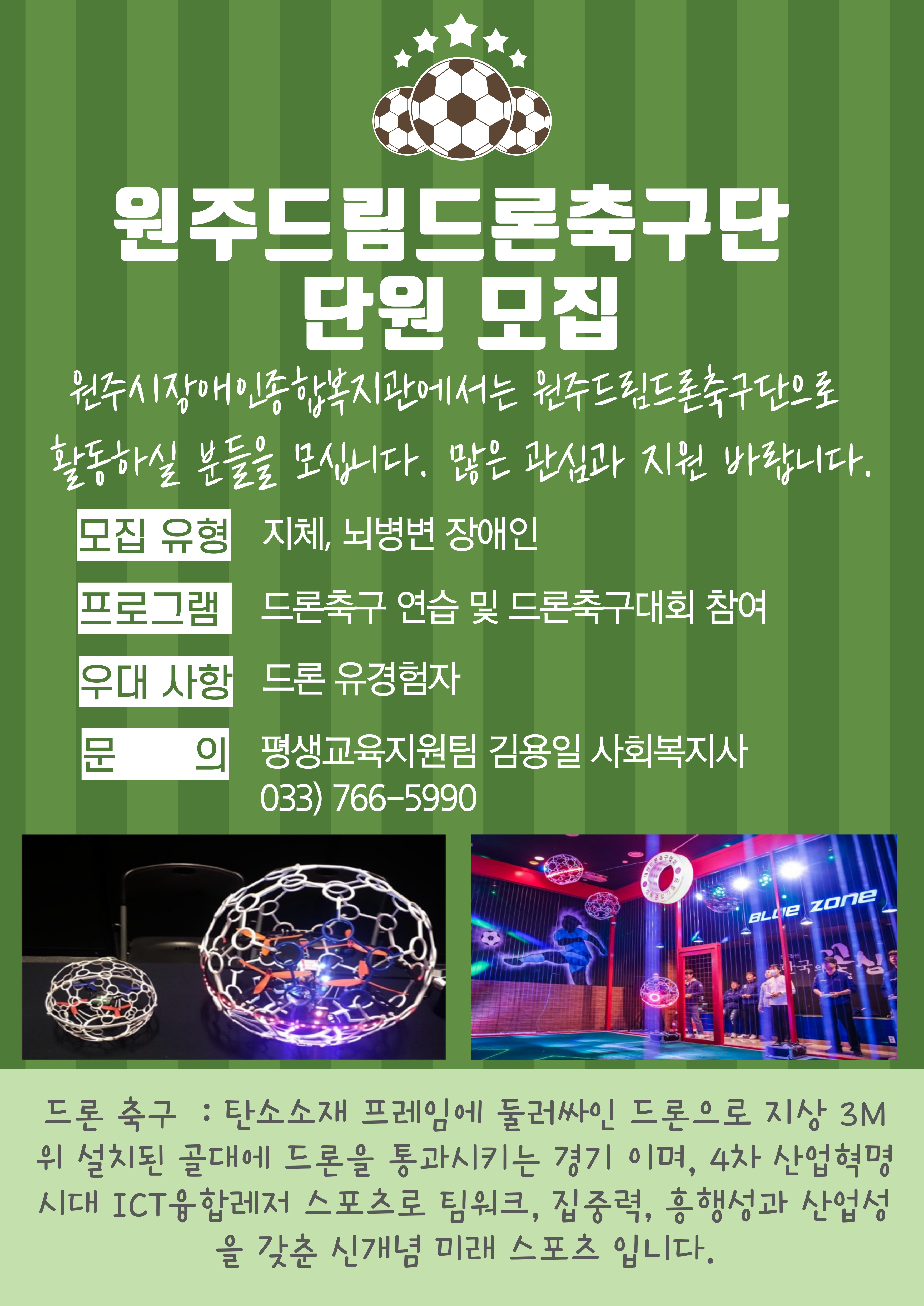 [강원사회복지신문 홍기한 기자]=원주시장애인종합복지관(관장 정진애)은 2021년부터 원주지역 최초로 지체 및 뇌병변 장애인을 대상으로 스포츠 참여의 기회를 제공하고 비장애인들과의 스포츠격차를 해소하기 위해 원주드림드론축구단을 운영하였으며, 같은 해 7월 창단식도 진행하였다. 2021년에는 코로나19로 인해 대회가...