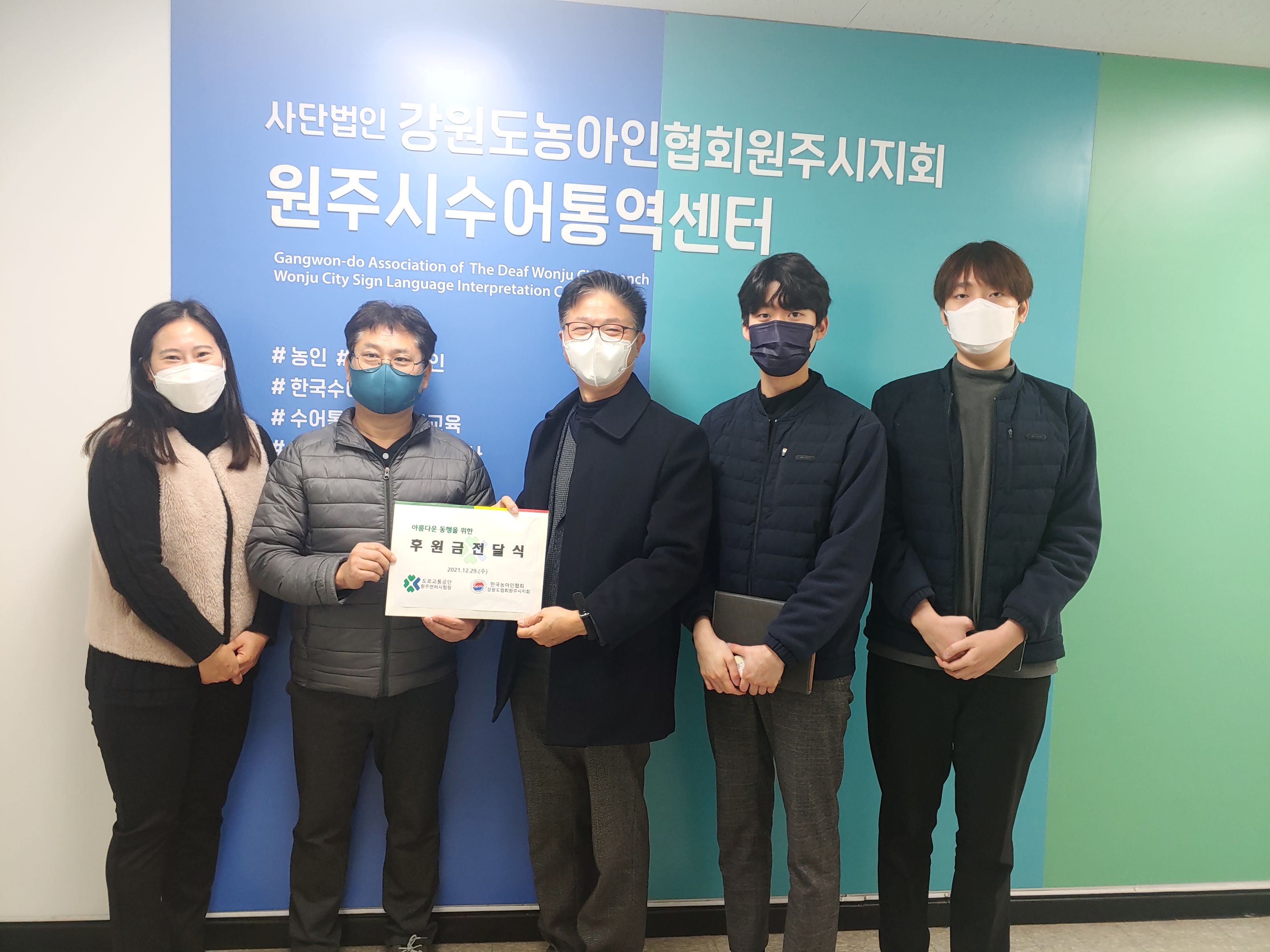 [강원사회복지신문 서은진 기자]=도로교통공단 원주운전면허시험장(장장 이국환) 직원들은 지난 12월 29일(수) 십시일반 모은 후원금으로 100만원의 온누리상품권을 사)강원도농아인협회원주시지회(지회장 장재식)에 전달하였다. 원주운전면허시험장은 2019년 농아인협회와 협약하여 청각장애인의 운전면허취득을 위해 지원해...