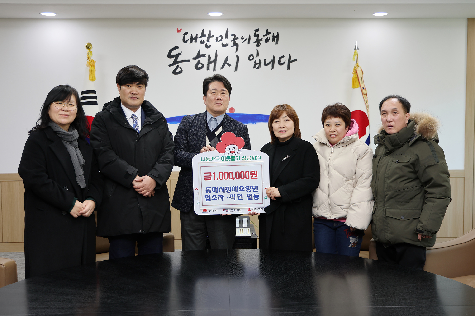 2024 강원사회복지공동모금회 지원사업 중증장애인 작품 판매 수익금 및 직원 성금 기탁 동해시장애요양원(시설장: 조은희)은 지난 2025.1.8.(수) 동해시청(시장 권한대행 문영준)을 방문하여 희망2025나눔캠페인 이웃돕기 성금 1,000,000원을 기탁하였다. 동해시장애요양원은 2024강원사회복지공동모금회 지원사업으로 시설...
