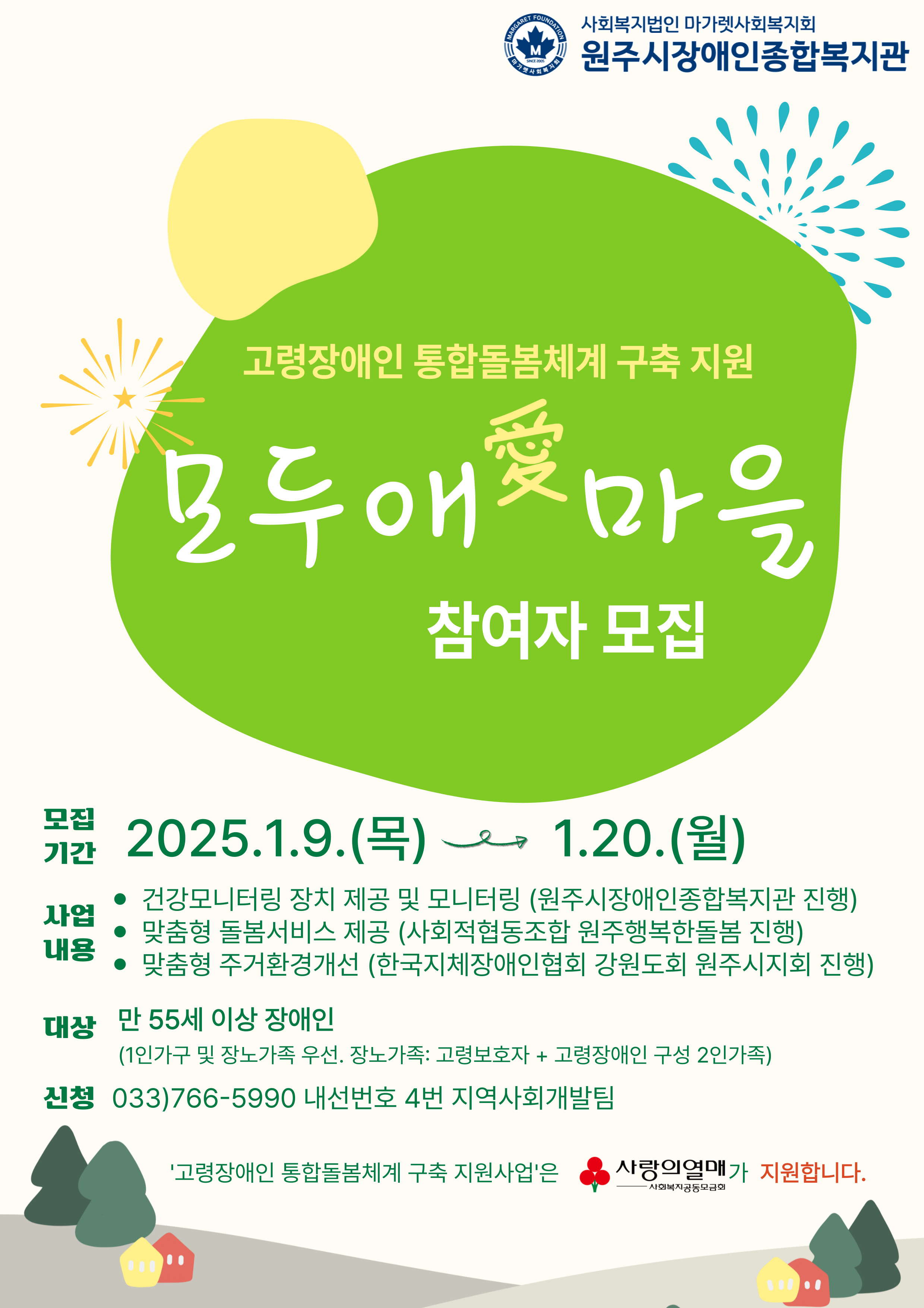 원주시장애인종합복지관(관장 정진애)은 지역사회 내 고령장애인을 대상으로 하는 2025년 고령장애인 통합돌봄체계 구축 “모두애(愛)마을” 사업 참여자를 모집한다. 모집 기간은 2025년 1월 9일(목) ~ 20일(월)까지이며, 2025년 2월 3일부터 2025년 12월 19일까지 이용자에게 지역사회내 계속 거주(Aging In Place)를 위한...