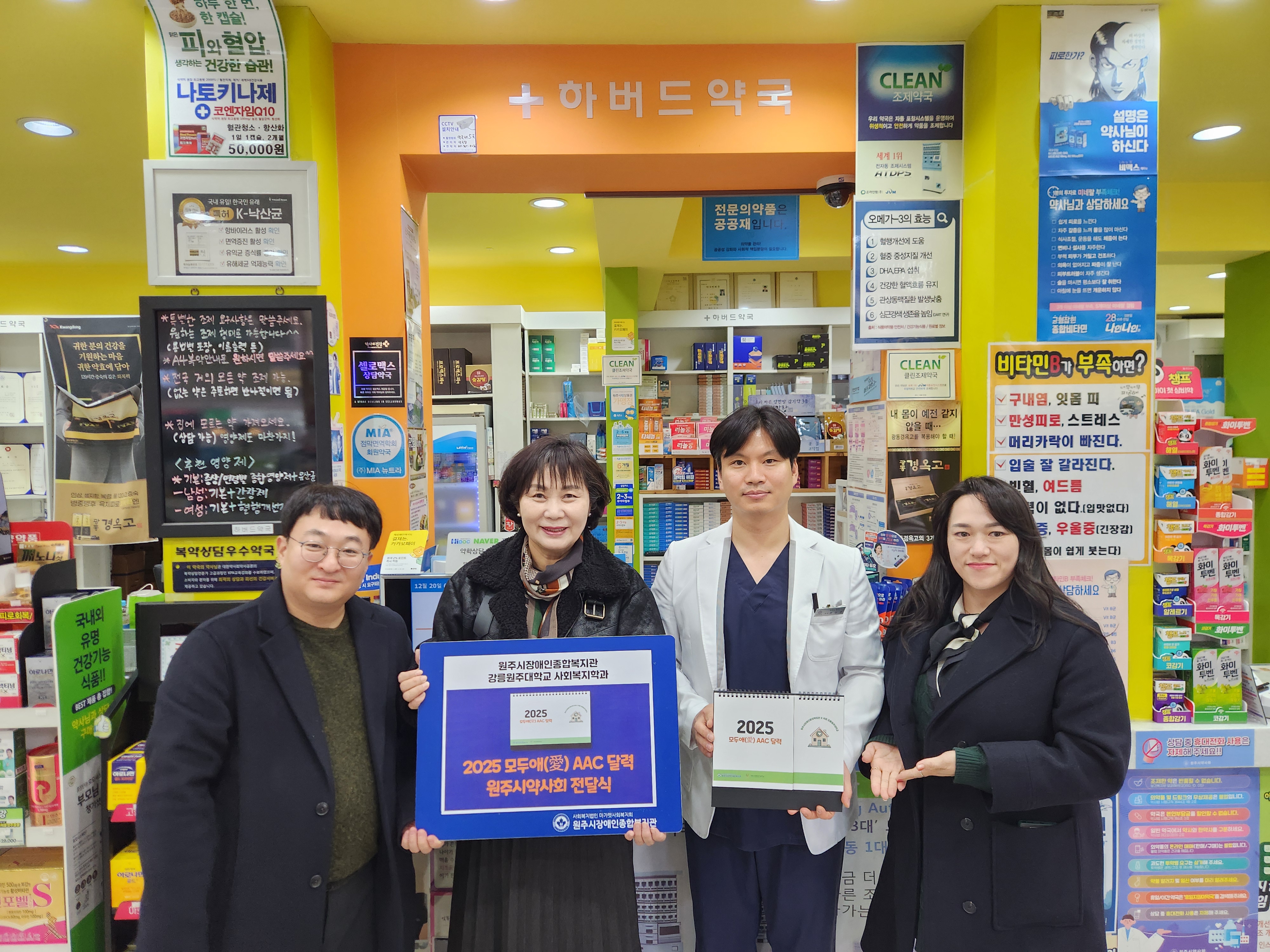 원주시장애인종합복지관(관장 정진애)은 1월 3일(토) 원주시약사회(회장 엄일훈, 원주 하버드약국)에 강릉원주대학교와 함께 제작한 2025년 AAC(보완대체의사소통)캘린더 AAC캘린더를 전달하였다. 약국에 비치되는 AAC캘린더는 의사소통이 어려운 장애인과 외국인이 활용가능 하도록 그림으로 표시되어 있어 약국이용에 도움...