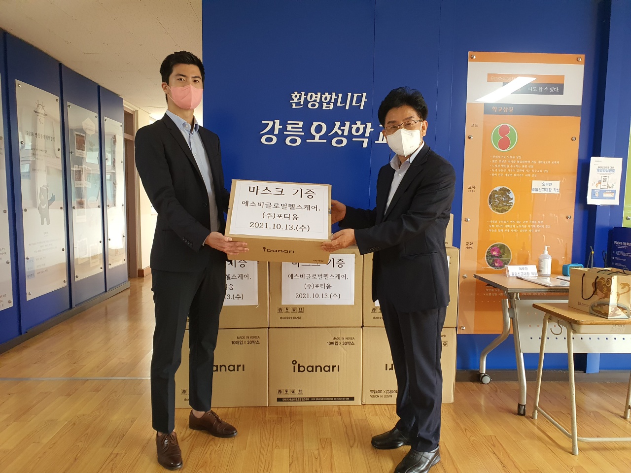 [강원사회복지신문 홍기한 기자]=강원도교육청은 지난 10월 13일(수), 원주기업도시에 위치한 (주)포티움(대표 엄성흠)으로부터 감염병 예방을 위한 항균 은사 마스크 10,000장을 기부받았다고 밝혔다. 이날 오후에는 (주)포티움 엄성흠 대표가 강릉 오성학교에 방문하여 기증품 전달식을 진행하였으며 기증받은 마스크는 도...