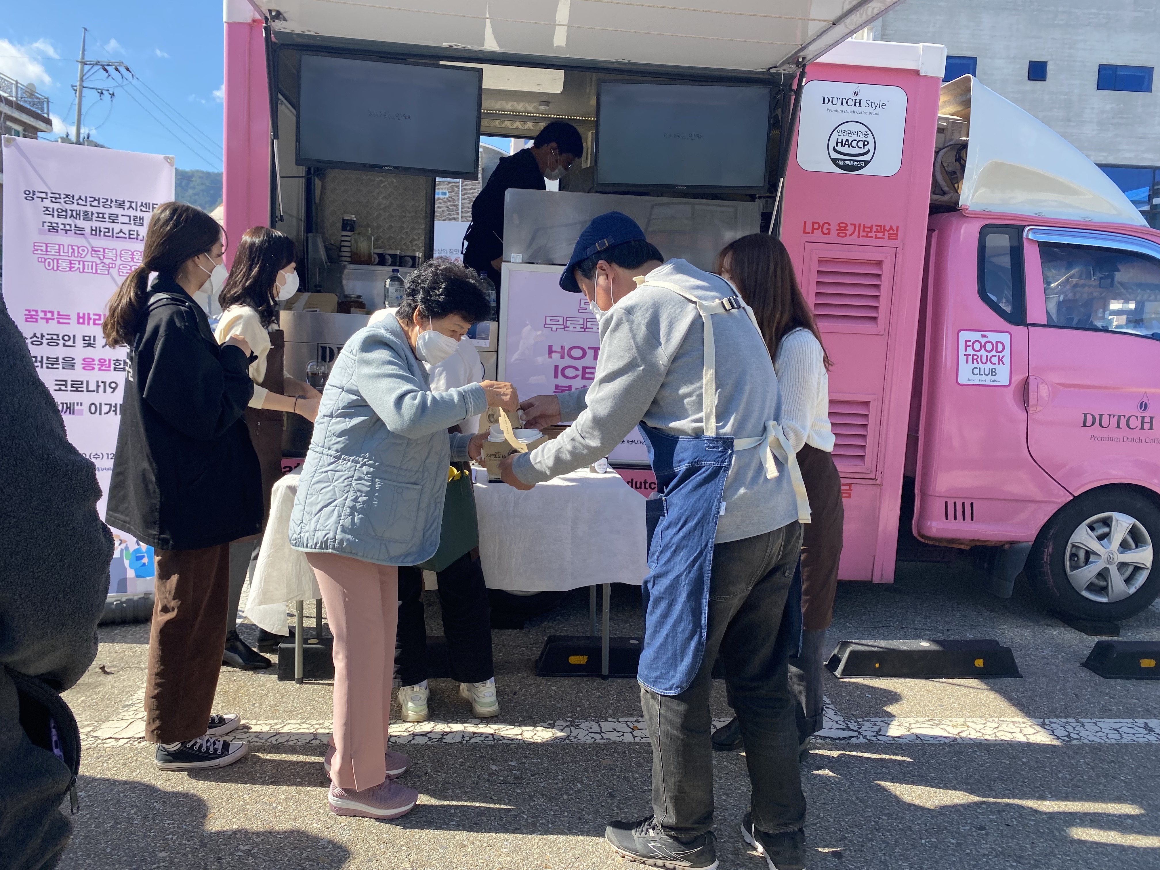 [강원사회복지신문 서은진 기자]=양구군정신건강복지센터 지원으로 올해 5명 바리스타 자격증 획득 농협 양구군지부 옆 공영주차장에서 12~15시 커피 무료 제공 코로나19 극복 의미 담아 8월에 이어 2번째 행사 마련 바리스타 자격증을 획득한 정신장애인들이 지난 10월 20일 오후 12시부터 3시간 동안 NH농협 양구군지부 옆...