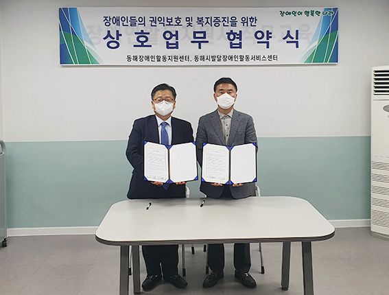 [강원사회복지신문 김종한 기자]=동해장애인활동지원 센터와 동해시발달장애인활동서비스 센터는 상호 긴밀한 협력을 통한 동해시 장애인들의 삶의 질을 높일 수 있는 전문적 서비스와 함께 장애인들의 권익을 보호하고 복지증진을 위해 지난 6월 10일 오후 2시 상호 업무협약을 체결하였다.