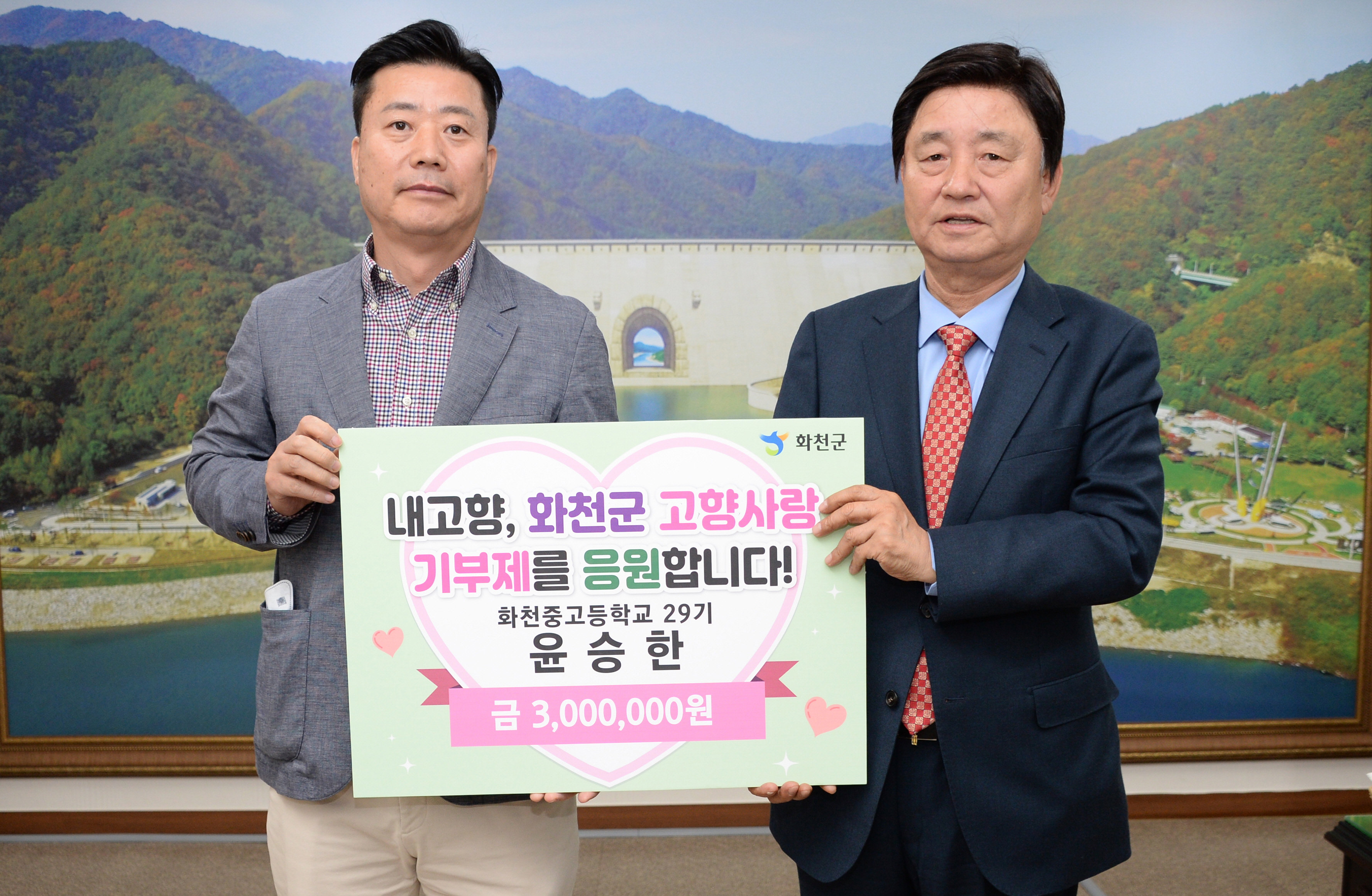 [강원사회복지신문 서은진 기자]=윤승한 화천중고등학교 29기 동문이 지난 4월 6일 최문순 화천군수를 방문해 화천군 고향사랑 기부금 300만원을 기탁했다.