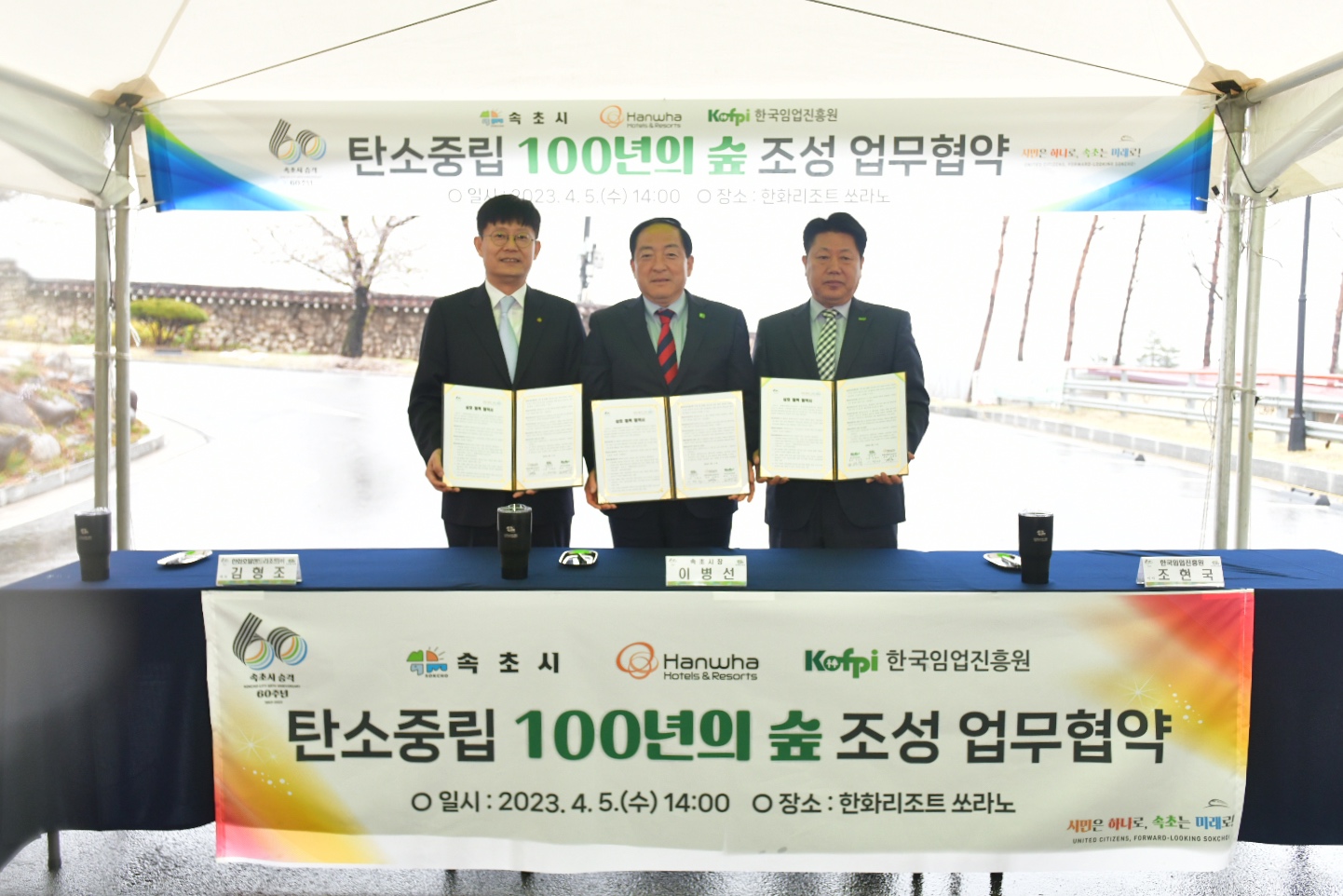 [강원사회복지신문 김종한 기자]=2019년 속초·고성 산불 피해지 총 42ha에 소나무 식재 속초시는 지난 4월 5일(수) 제78회 식목일을 맞이하여 한화호텔앤드리조트 및 한국임업진흥원과 함께 '탄소중립 100년의 숲' 조성을 위한 상호 업무협약(MOU)을 체결하였다. 이번 협약에는 이병선 속초시장, 김형조 한화호텔앤드리조트...
