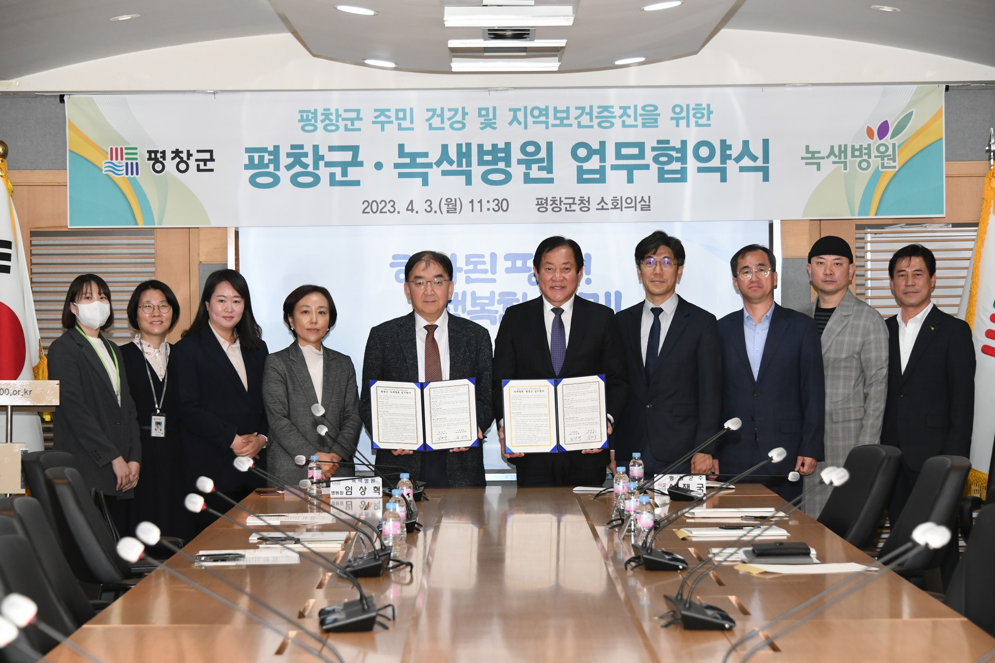 [강원사회복지신문 김종한 기자]=평창군은 지난 4월 3일 오전 11시 30분 군청 소회의실에서 심재국 평창군수와 임상혁 병원장 및 관계자 10여명이 참석한 가운데, 지역주민 건강 및 지역보건증진을 위한 녹색병원 의료 협약식이 진행되었다.