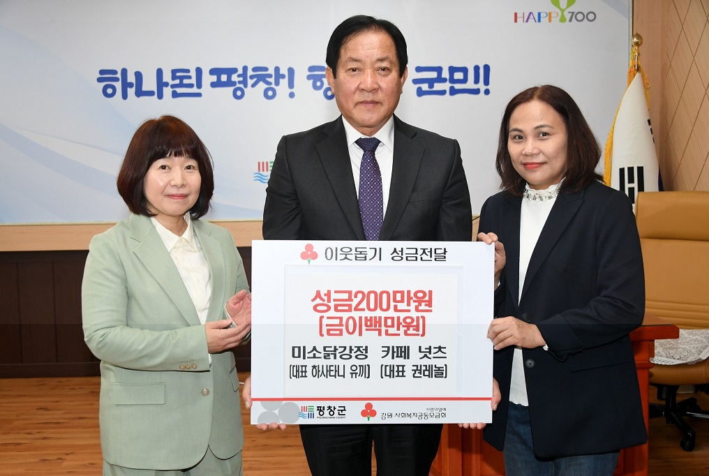 [강원사회복지신문 김종한 기자]=평창 미소닭강정(대표 하사타니 유끼)과 카페 넛츠(대표 권레놀)은 지난 3월 20일 평창군청을 방문하여 불우이웃 돕기 성금 200만원을 전달하였다. 평창 미소닭강정은 다문화 이주여성 하사타니 유끼씨가 운영하는 닭강정 가게로, 2020년 11월 평창군 홍보 대사 이원일 셰프가 재능기부로 닭...