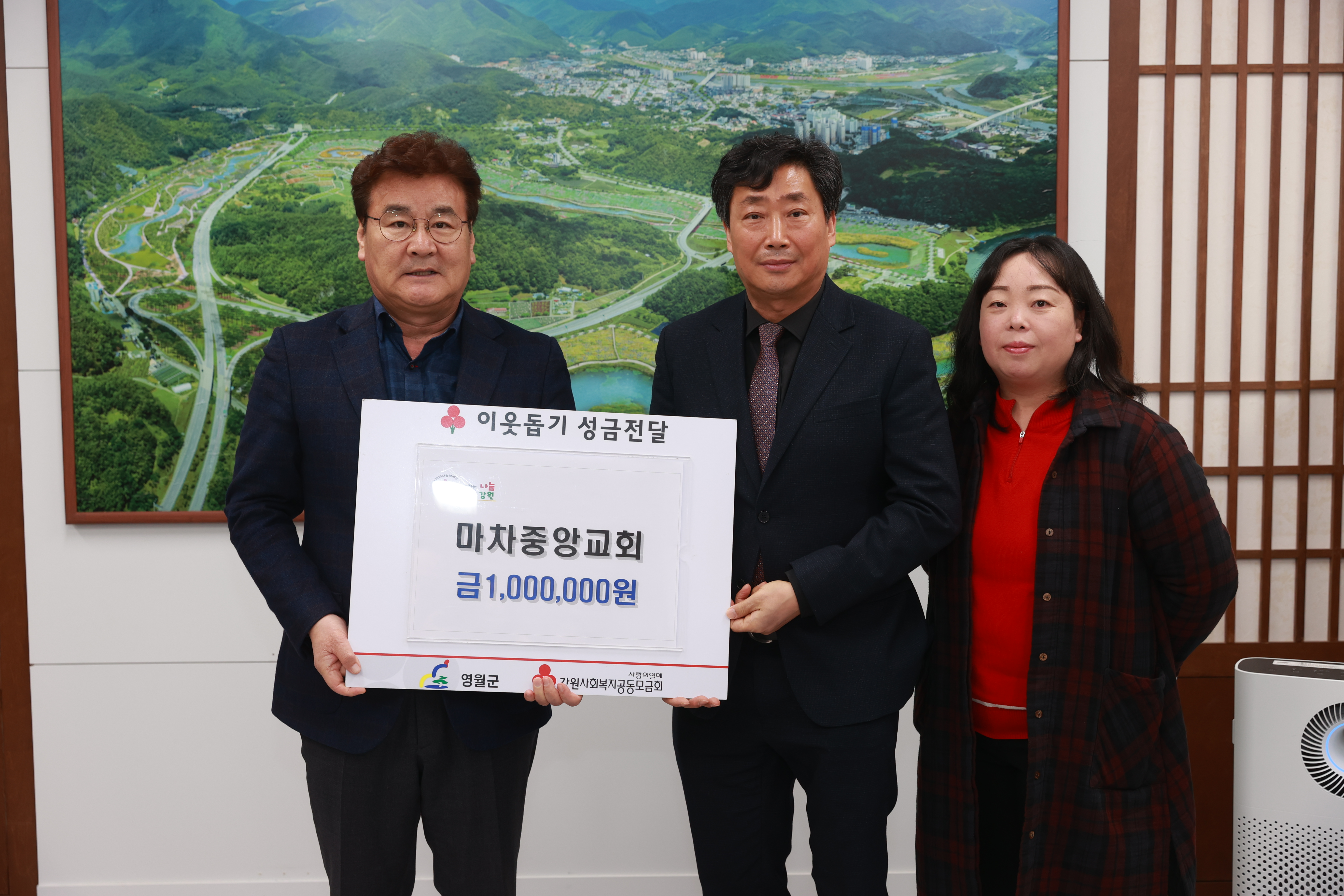 [강원사회복지신문 이정환 기자]=영월군 북면 마차중앙교회(목사 유혁준)는 지난 3월 9일 영월군청을 방문해 이웃돕기 성금 1백만원을 기탁했다.