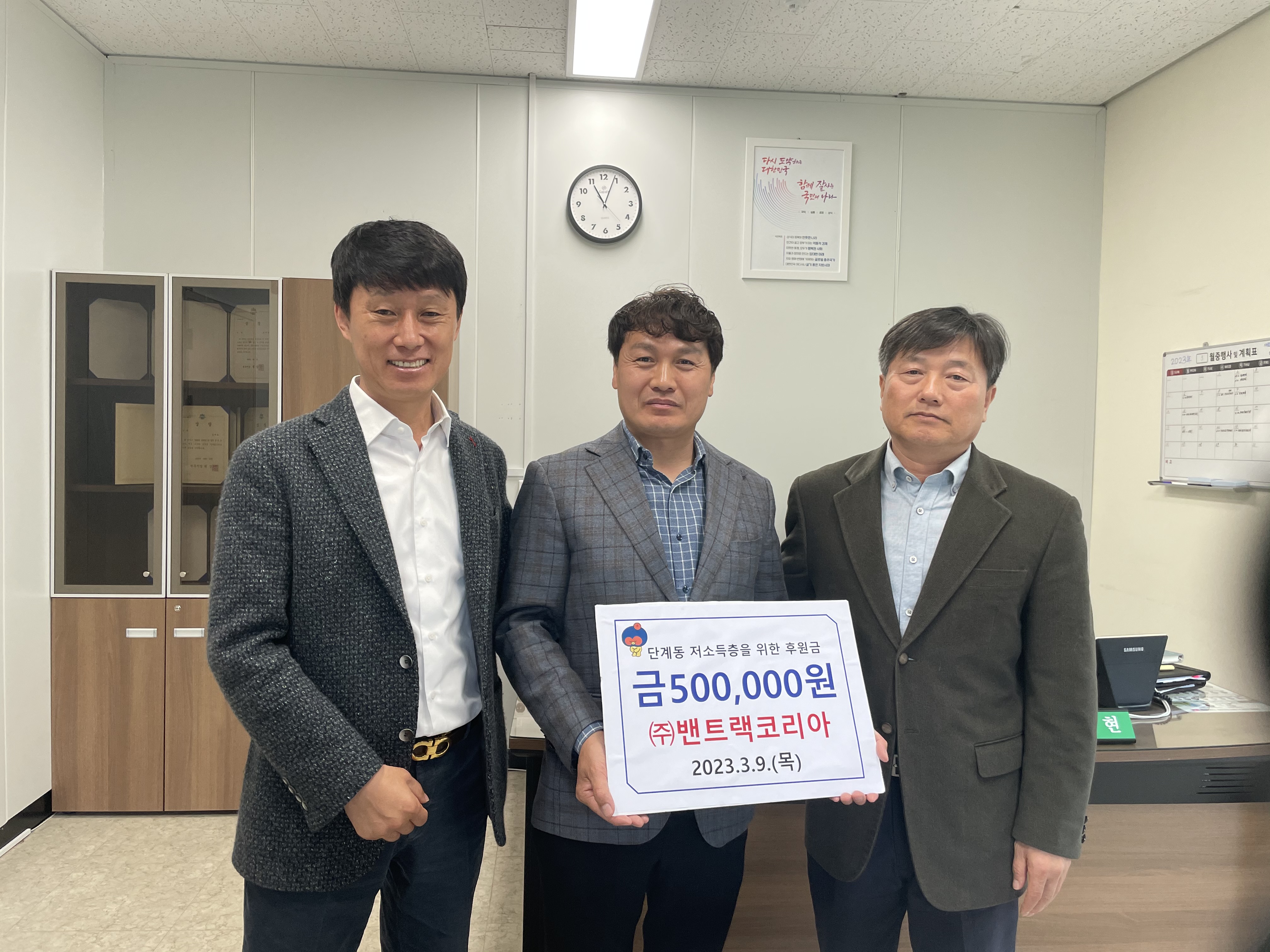 [강원사회복지신문 이정환 기자]=(주)밴트랙코리아(대표이사 심경록)와 천호관광(대표 천호영)은 지난 3월 9일 원주시 단계동 행정복지센터를 방문해 단계동 지역사회보장협의체(공공위원장 김주현, 민간위원장 김주백)에 각각 후원금 50만 원씩을 기탁했다. 후원금은 단계동지역사회보장협의체 2023년 특화사업인 '중·고등...