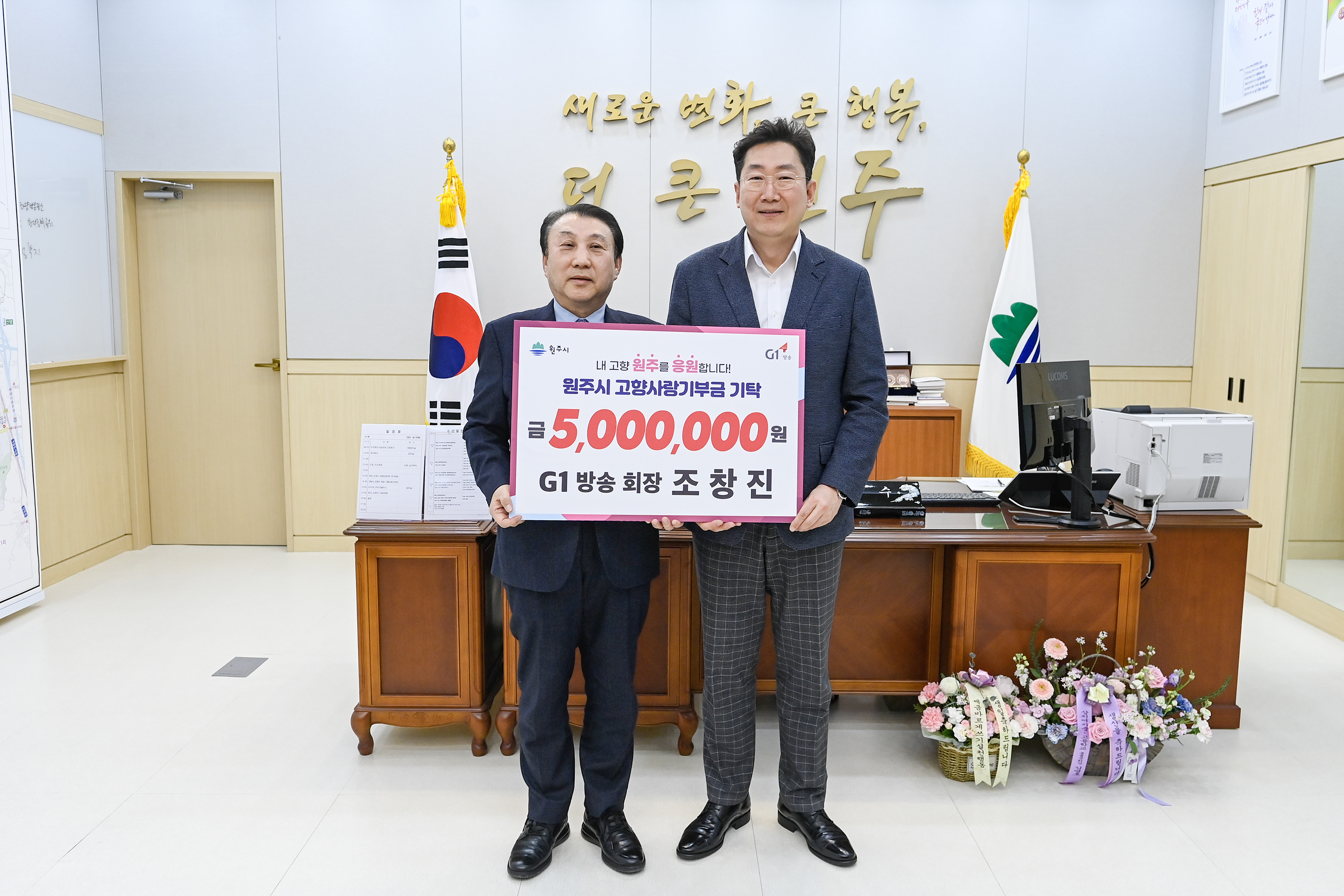 [강원사회복지신문 김도연 기자]=원주시는 고향사랑기부제 제5호 고액기부자가 탄생했다고 밝혔다. 지난 3월 7일 횡성 출신의 조창진 G1방송 회장이 원주시청을 방문해 고향사랑기부금 500만 원을 쾌척하면서 제5호 고액 기부자로 이름을 올렸다. 이 밖에도 많은 출향 향우들이 고향사랑기부제에 동참하고 있다. 조창진 회장...