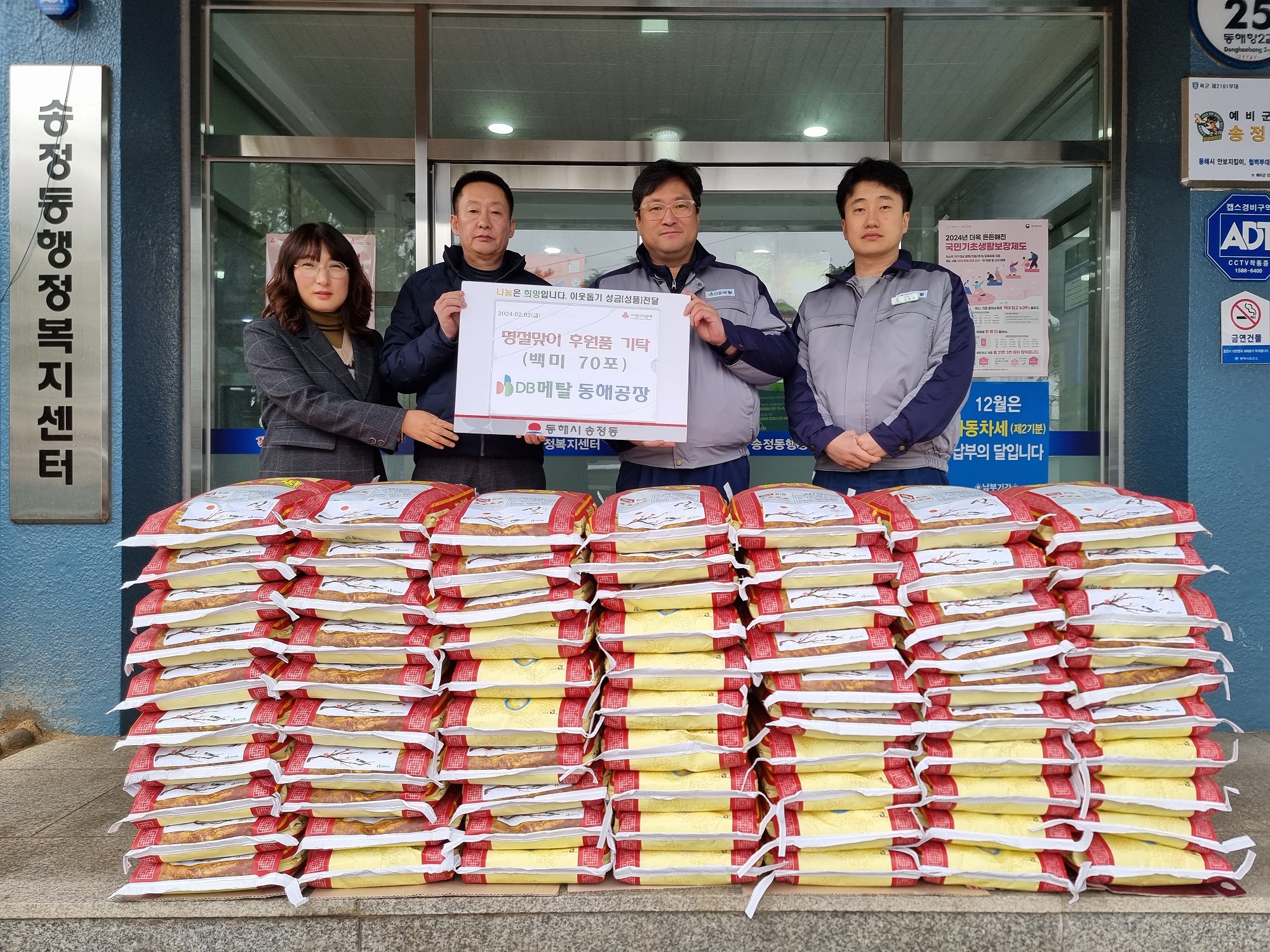 DB메탈 동해공장(공장장 전상수)은 지난 2월 2일(금) 설 명절을 맞아 어려운 가정에 전달해달라며 백미10kg 70포를 기탁하였다.