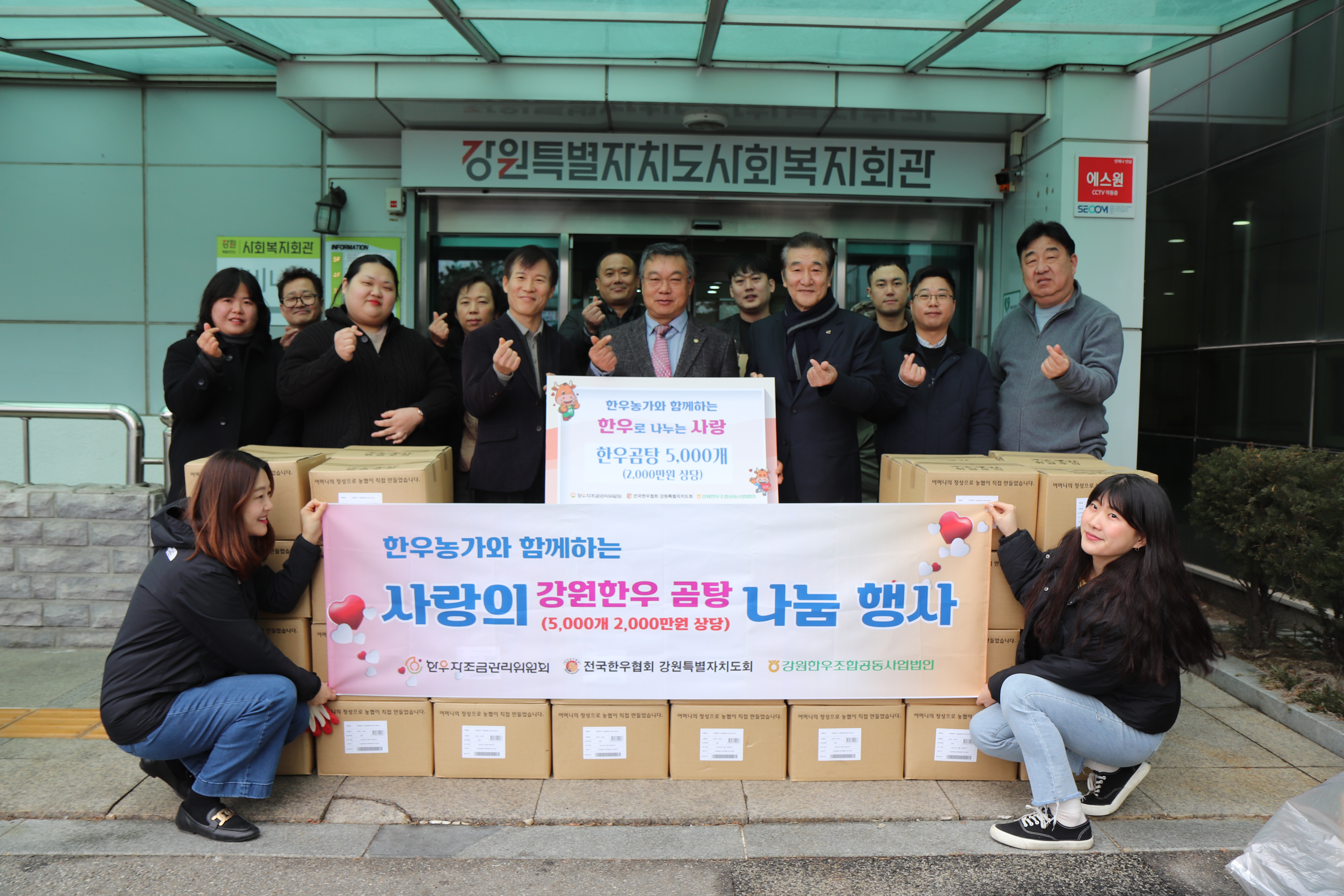 전국한우협회강원특별자치도지회(지회장 박영철)는 지난 2월 5일 오전 11시 강원특별자치도사회복지회관에서 한우곰탕(5,000개 / 2,000만원 상당)을 강원특별자치도사회공헌정보센터(센터장 홍기종)을 통해 기탁했다. 이날 전국한우협회강원특별자치도지회에서 기탁한 한우곰탕(5,000개 / 2,000만원 상당)은 설 명절을 맞이하...