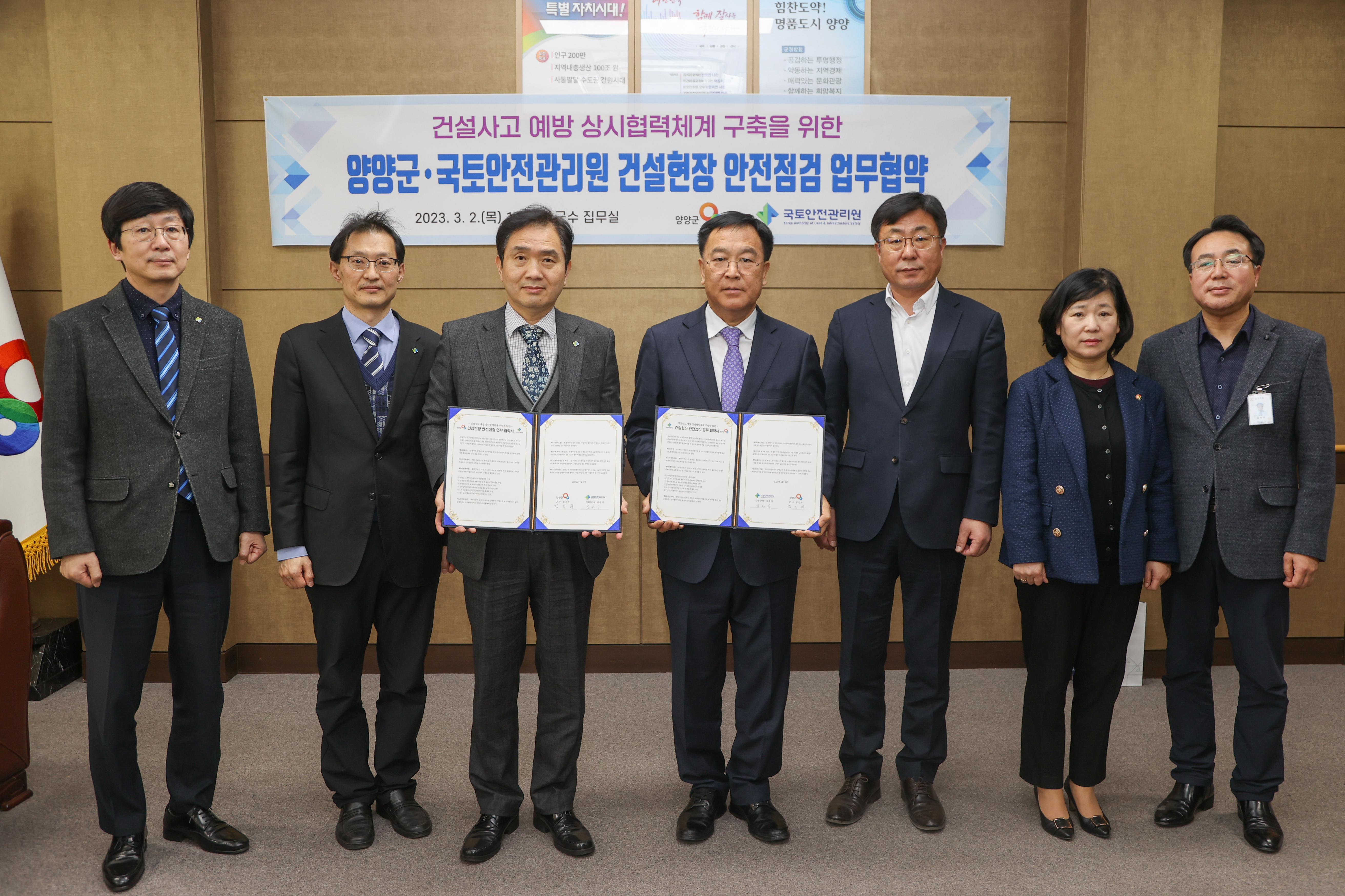 [강원사회복지신문 김종한 기자]=건설사고 예방 상시협력체계 구축을 위한 업무협약 체결 건축공사장 합동점검 등 상호 지원으로 건설 안전관리에 박차 양양군이 건축공사장 안전관리를 위해 국토안전관리원과 손을 잡았다. 김진하 양양군수는 지난 3월 2일 집무실에서 김광식 국토안전관리원 강원지사장과 건설현장 안전점검...