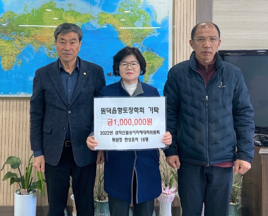 [강원사회복지신문 김종한 기자]='2022년 삼척 산불 송이피해 대책위원회(위원장 한상훈)'에서 재단법인 원덕읍향토장학회에 100만 원을 기탁하였다. 재단법인 원덕읍향토장학회는 삼척시 원덕읍 지역 출신 재학생(고등학생, 대학생, 전문대생)에게 장학금 지급과 교육 관련 사업을 통해 지역인재육성에 앞장서고 있으며, 이...