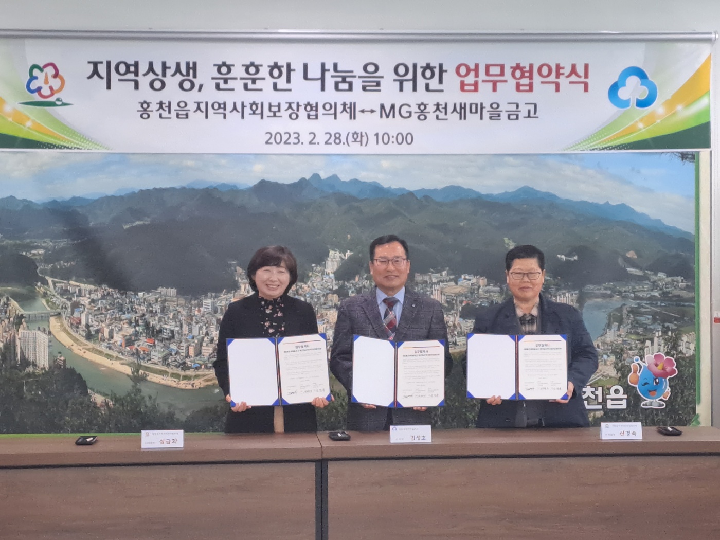 [강원사회복지신문 서은진 기자]=홍천읍지역사회보장협의체(공공위원장 심금화, 민간위원장 신경숙)와 MG홍천새마을금고(이사장 김생호)는 지난 2월 28일 홍천읍행정복지센터에서 '지역상생, 훈훈한 나눔을 위한 업무협약'을 체결했다. 이번 협약으로 나눔과 배려의 지역복지 생태계를 만들기 위한 홍천읍지역사회보장협의체...