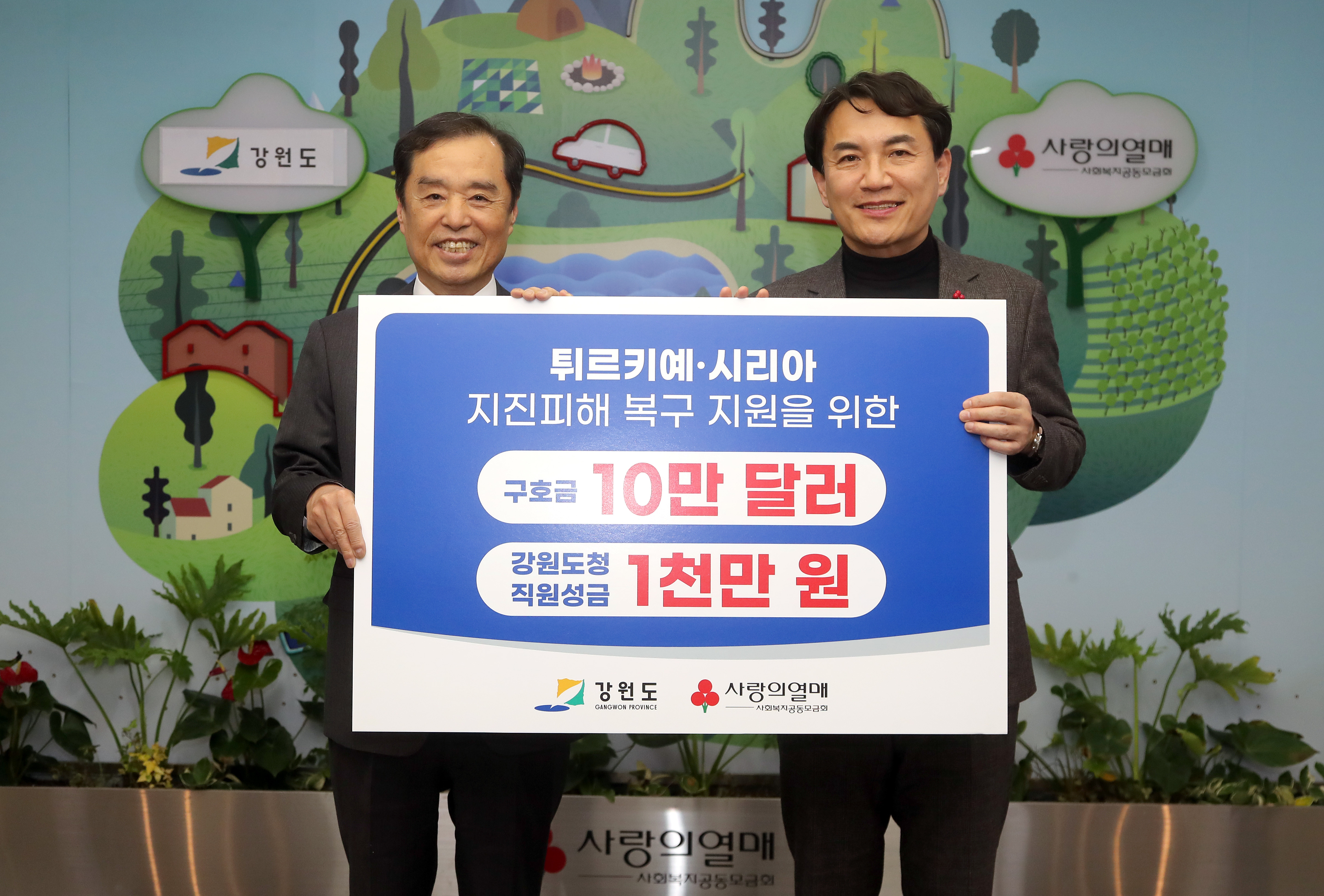 [강원사회복지신문 김도연 기자]=구호금 10만 달러 및 도청직원 성금 1천만 원, 사회복지공동모금회 통해 전달 지난 2월 24일(금) 17시 김진태 강원도지사가 사랑의열매 사회복지공동모금회(이하 사랑의열매) 김병준 중앙회장을 만나 튀르키예·시리아 재난구호금을 직접 전달했다. 강원도는 강진으로 막대한 피해를 입은 튀...