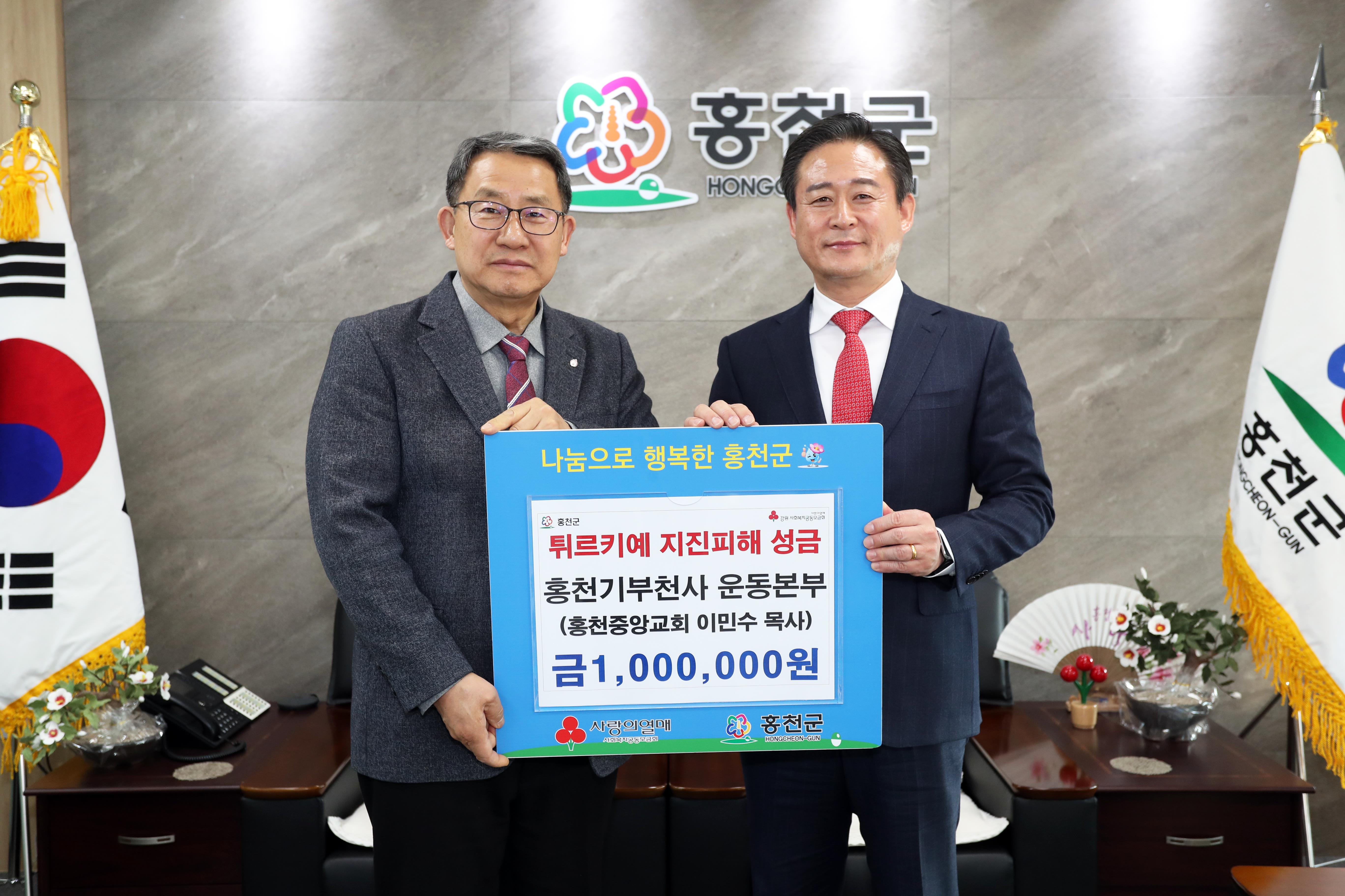 [강원사회복지신문 홍기한 기자]=홍천기부천사 운동본부(홍천중앙교회 이민수 목사)는 지난 2월 24일 홍천군청을 방문해 '2023년 튀르키예·시리아 지진 피해 지원 특별모금 캠페인'에 성금 100만원을 기탁했다. 이민수 목사는 "대규모 지진으로 피해를 입은 튀르키예와 시리아 국민들이 어려움을 극복하고 일상을 회복하는데...