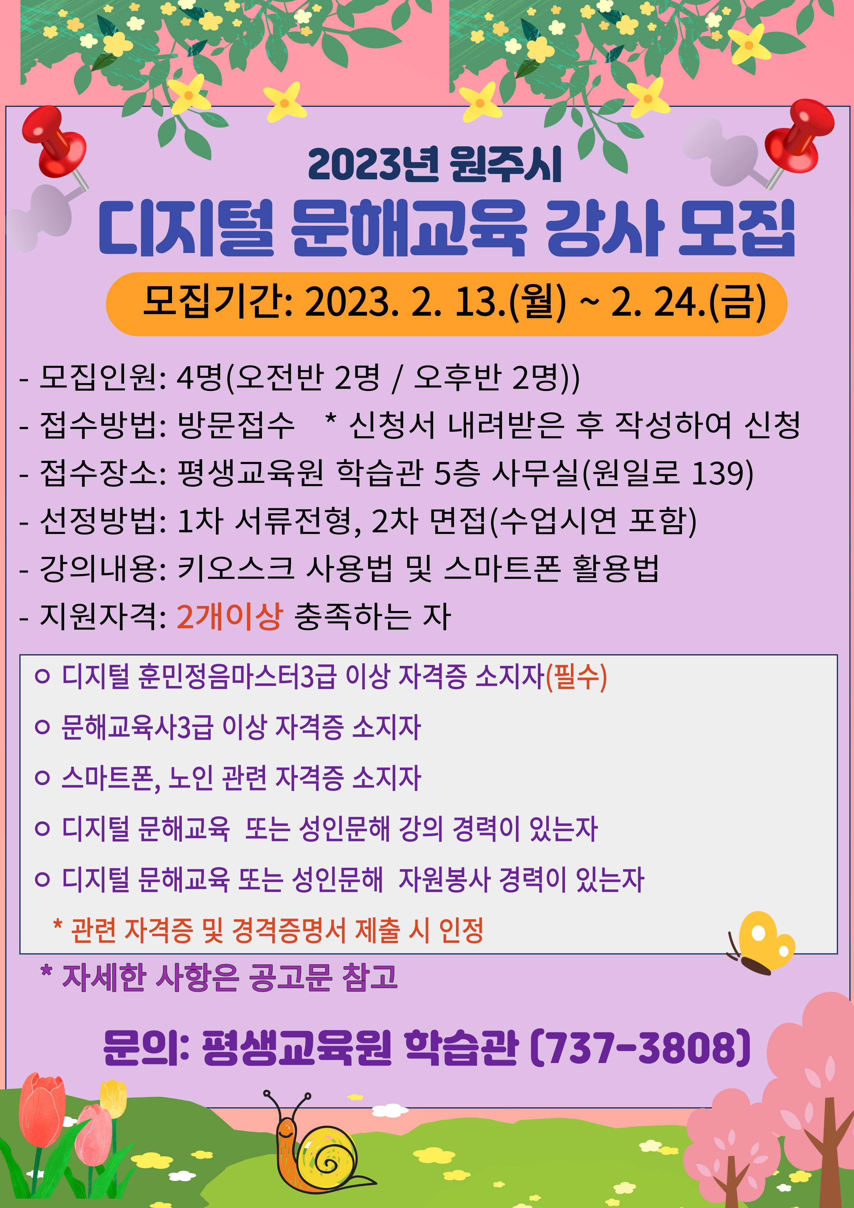 [강원사회복지신문 김도연 기자]=강사 4명 모집, 오는 2월 24일까지 학습관 방문 접수 ATM, 음식 주문 등 키오스크 사용법 및 스마트폰 활용법 강의 원주시 평생교육원 학습관은 디지털 문해교육 강사 4명을 공개모집 한다. 대상은 디지털 훈민정음마스터 3급 자격증 소지자(필수)로 디지털 문해교육 또는 성인문해 강의경력...