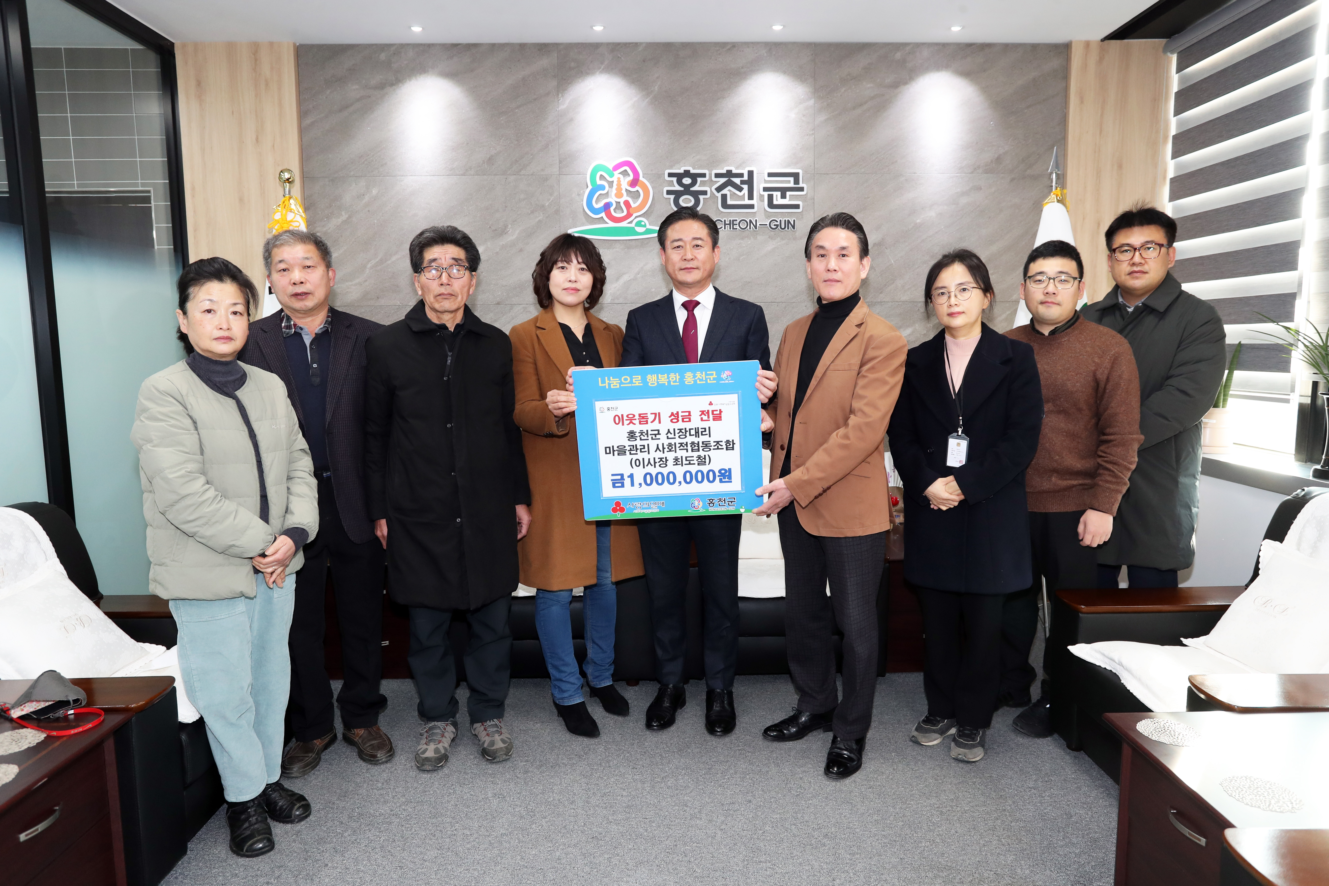 [강원사회복지신문 홍기한 기자]=홍천군 신장대리 마을관리 사회적협동조합(이사장 최도철, 이하 마을조합)은 지난 2월 15일 홍천군청을 방문, 어려운 이웃돕기 성금 100만원을 기탁했다. 신장대리 마을조합은 원도심 활성화 도시재생사업 종료 이후 지속성을 확보하기 위해 지역 유지·관리와 공동체 활성화를 추진할 주민 ...