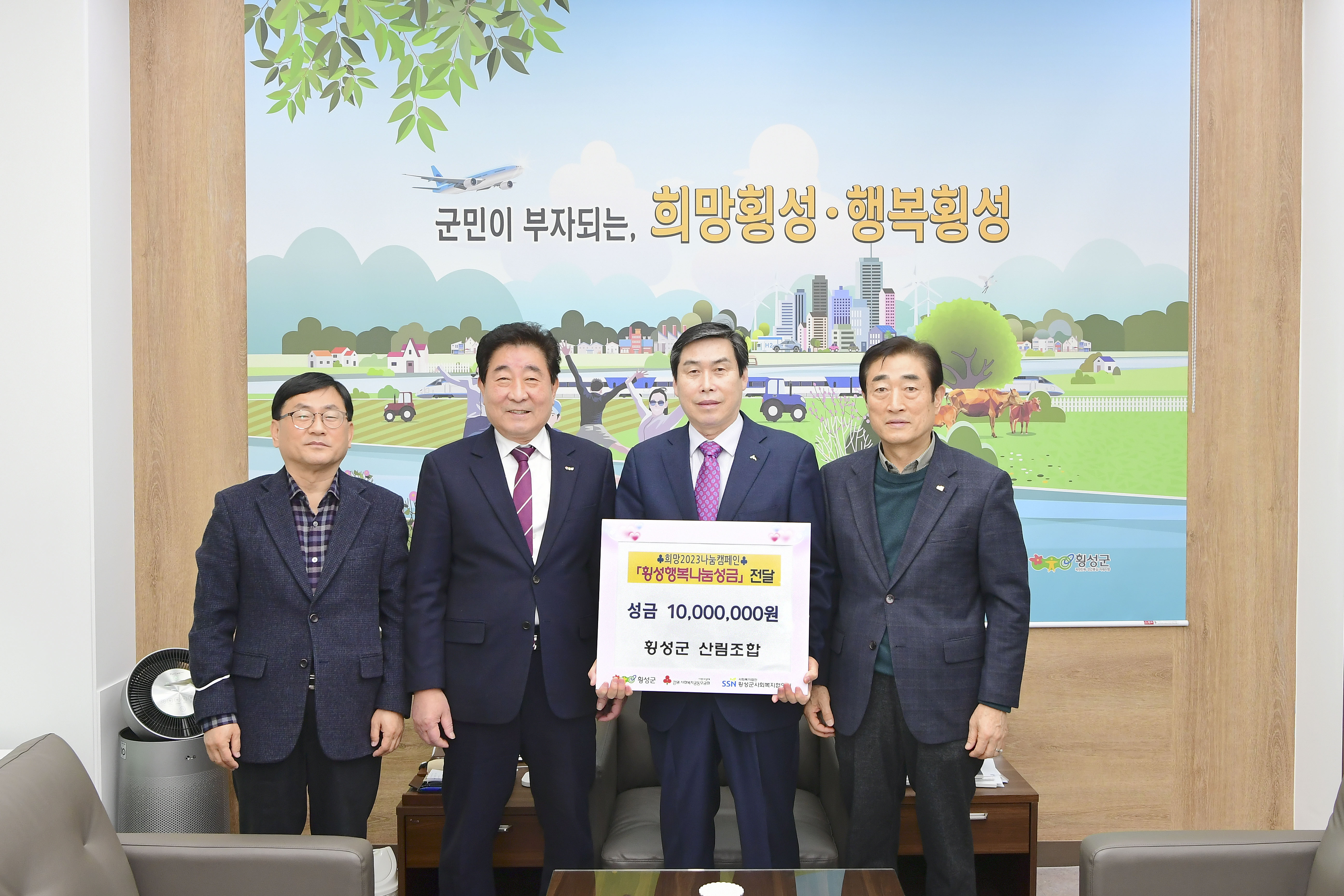 [강원사회복지신문 홍기한 기자]=횡성군 산림조합(조합장 양재관)은 지난 2월 14일 횡성군청 군수집무실을 방문하여 성금 1,000만원을 '횡성행복나눔성금'에 기탁하였다. 이날 전달식에는 김명기 횡성군수와 양재관 조합장, 이석원 횡성군사회복지협의회장 등이 참석하였다. 횡성군 산림조합은 매년 1,000만원 성금을 기탁하...