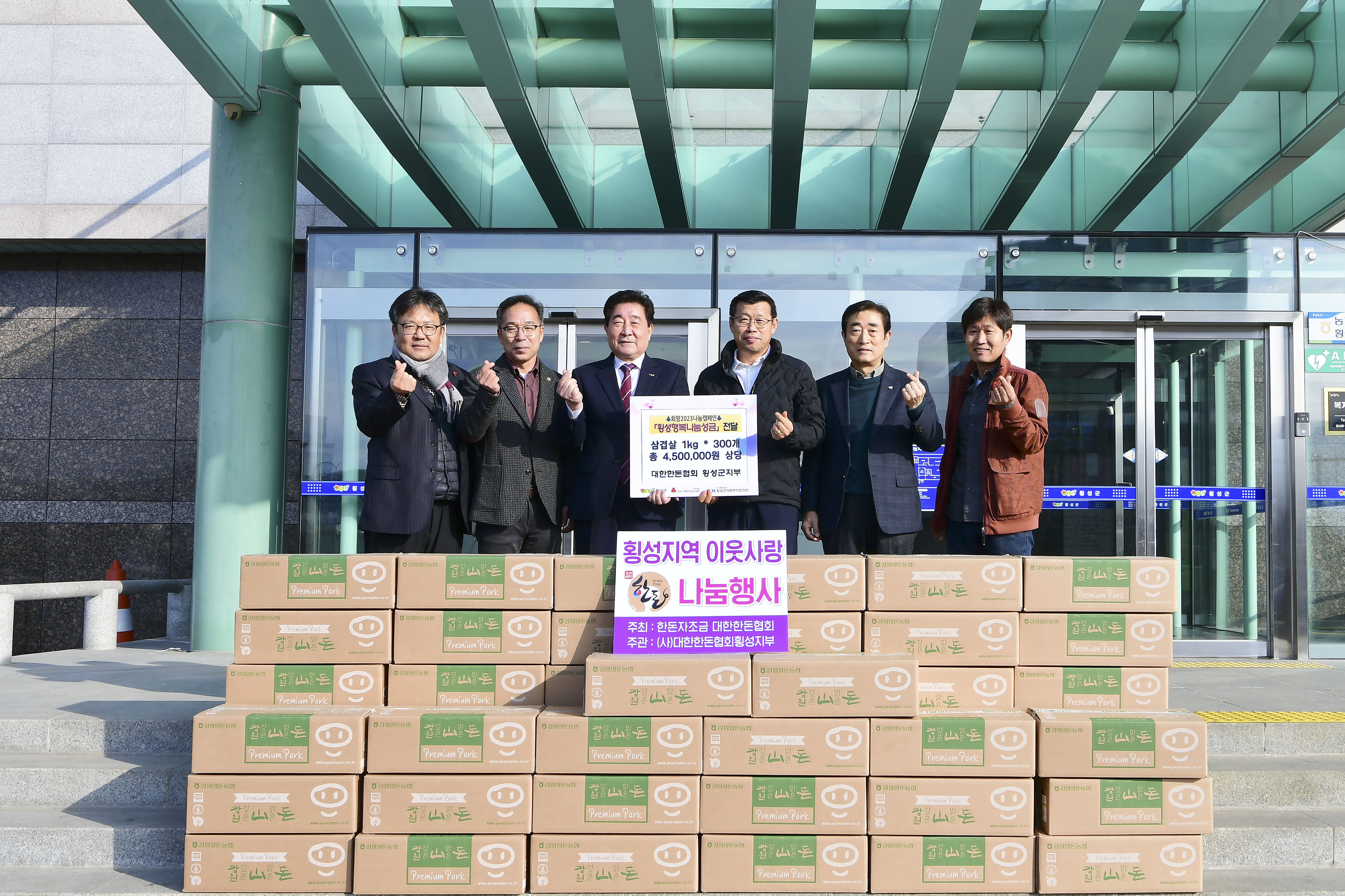 [강원사회복지신문 홍기한 기자]=대한한돈협회 횡성군지부(지부장 전길석)는 지난 2월 14일 횡성군청 군수집무실을 방문하여 돼지고기(삼겹살 300kg)를 '횡성행복나눔성금'에 기탁하였다. 이날 전달식에는 김명기 횡성군수와 전길석 지부장, 이석원 횡성군사회복지협의회장 등이 참석하였다. 기탁된 성품은 독거노인, 드림스...