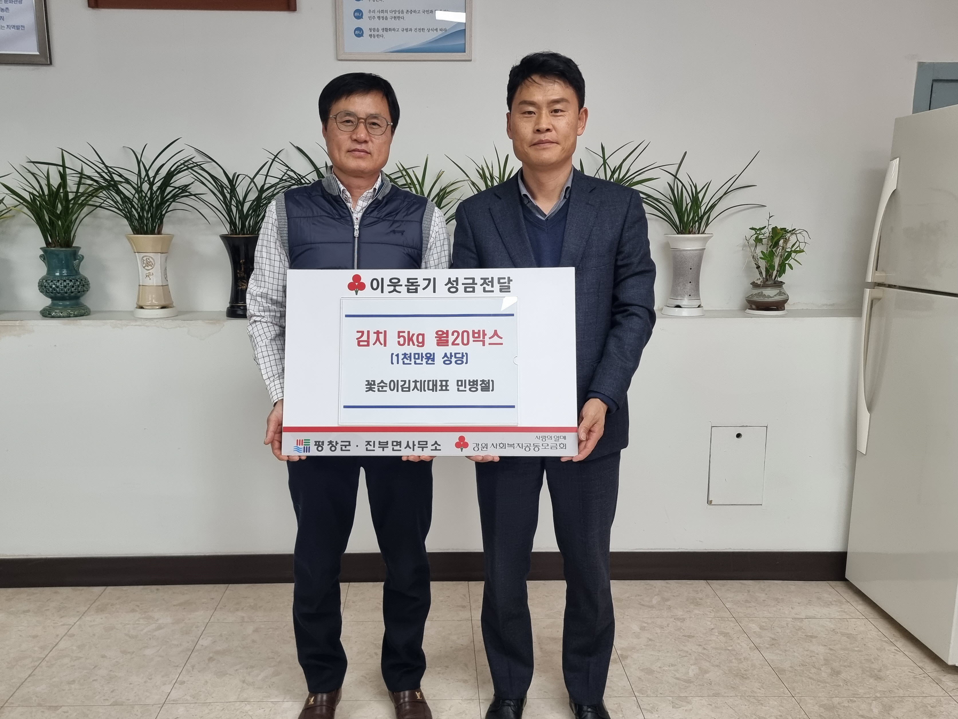 [강원사회복지신문 김종한 기자]=꽃순이 김치(대표 민병철)는 지난 2월 7일 평창군 진부면사무소를 방문하여 취약계층 이웃들을 위한 김치 20박스(5kg)를 기부하면서, 앞으로도 매월 정기적으로 김치를 나눔하겠다는 약속까지 전달했다. 해당 김치는 매월 취약계층 20가구를 선정하여 필요한 가구에 직접 전달할 예정이다. 민...