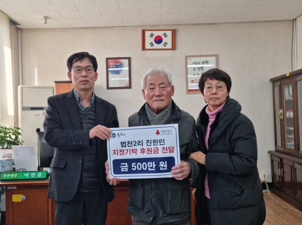 [강원사회복지신문 김도연 기자]=원주시 부론면 법천2리 진한민 씨는 지난 2월 1일 부론면 행정복지센터를 방문해 이웃돕기 성금 500만 원을 전달했다. 후원금은 2년여간 노인 일자리 사업에 참여해 마련한 돈으로, 자 신보다 어려운 관내 취약계층을 위해 써달라며 기탁했다.