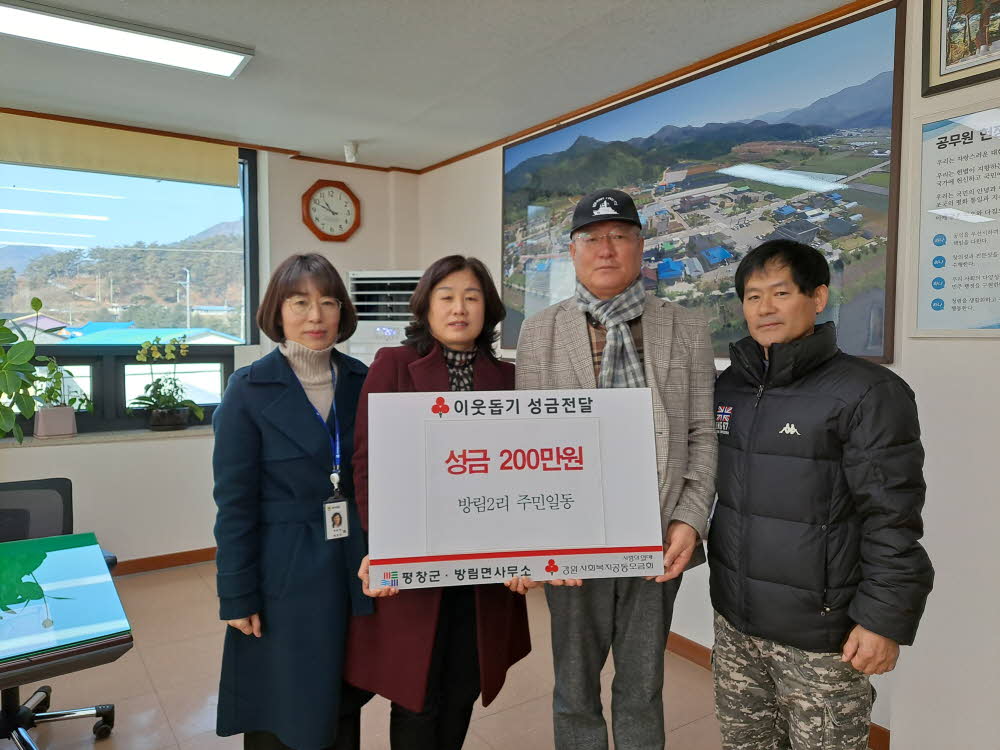 [강원사회복지신문 김종한 기자]=평창군 방림2리 주민들(이장 김남진)은 방림면사무소를 방문하여 방림면 저소득층을 위해 200만원을 기탁했다. 김남진 방림2리 이장은 "난방비 상승과 지속적인 한파로 인해 어려움을 겪고 있는 방림면의 저소득층 분들께 조금이나마 보탬이 되길 바란다."라고 말했다. 이에 김순란 방림면장...