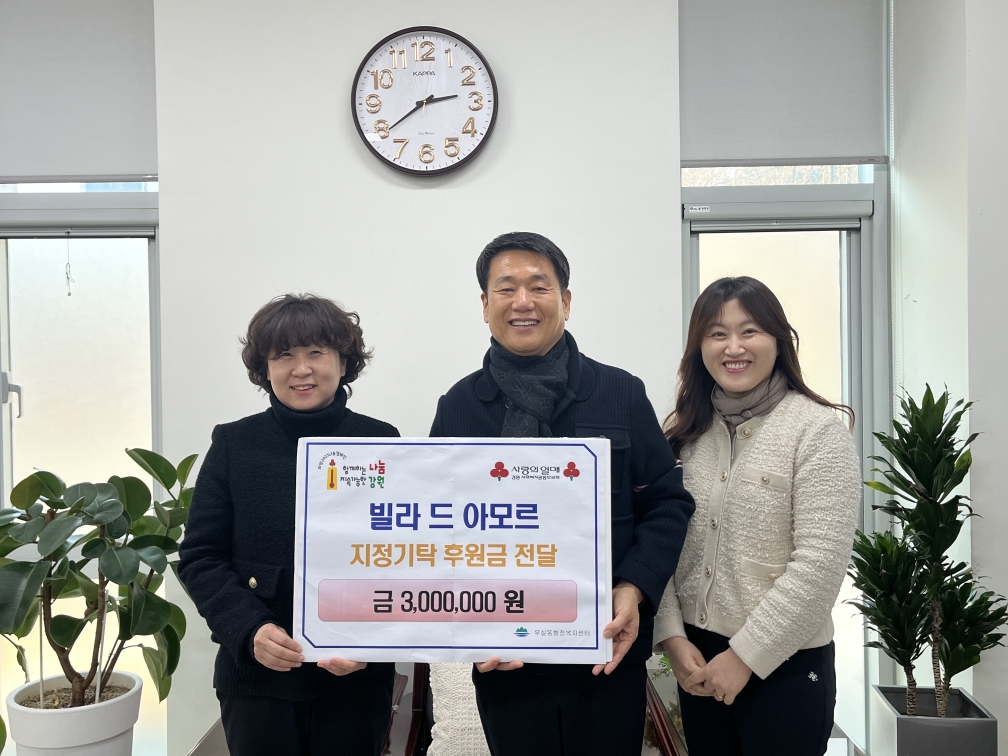 [강원사회복지신문 서은진 기자]=원주시 빌라드 아모르 웨딩홀(대표 김종태)은 지난 1월 31일 원주시 무실동 행정복지센터를 방문해 지정 기탁 후원금 300만 원을 전달했다. 후원금은 사회복지공동모금회를 통해 취약계층 및 복지사각지대 가구에 전달될 예정이다. 한편, 김종태 대표는 지역사회 소외계층을 위한 나눔 활동을...